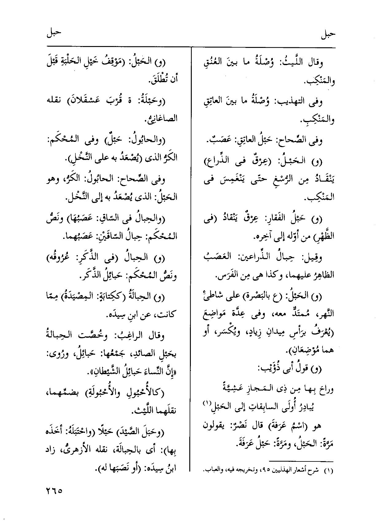 الحَبلُ: عِرقٌ فِي الذِّراع يَنْقَادُ مِن الرُّسْغِ حتّى يَنْغَمِسَ فِي المَنْكِب. حَبلُ الفَقارِ: عِرقٌ يَنْقادُ فِي الظَّهْرِ من أوّله إِلَى آخِره. وقِيل: حِبالُ الذِّراعين: العَصَبُ الظاهِرُ عَلَيْهِمَا، وَكَذَا هِيَ مِن الفَرَس. الحَبْلُ: ع بالبَصْرة على شاطئ النَّهر، مُمتَدٌّ مَعَه، وَفِي عَدّة مَواضِعَ يُعْرَفُ برَأسِ مِيدانِ زِيادٍ، ويُكْسَر، أَو هما مُوْضِعَانِ. قولُ أبي ذُؤَيب: