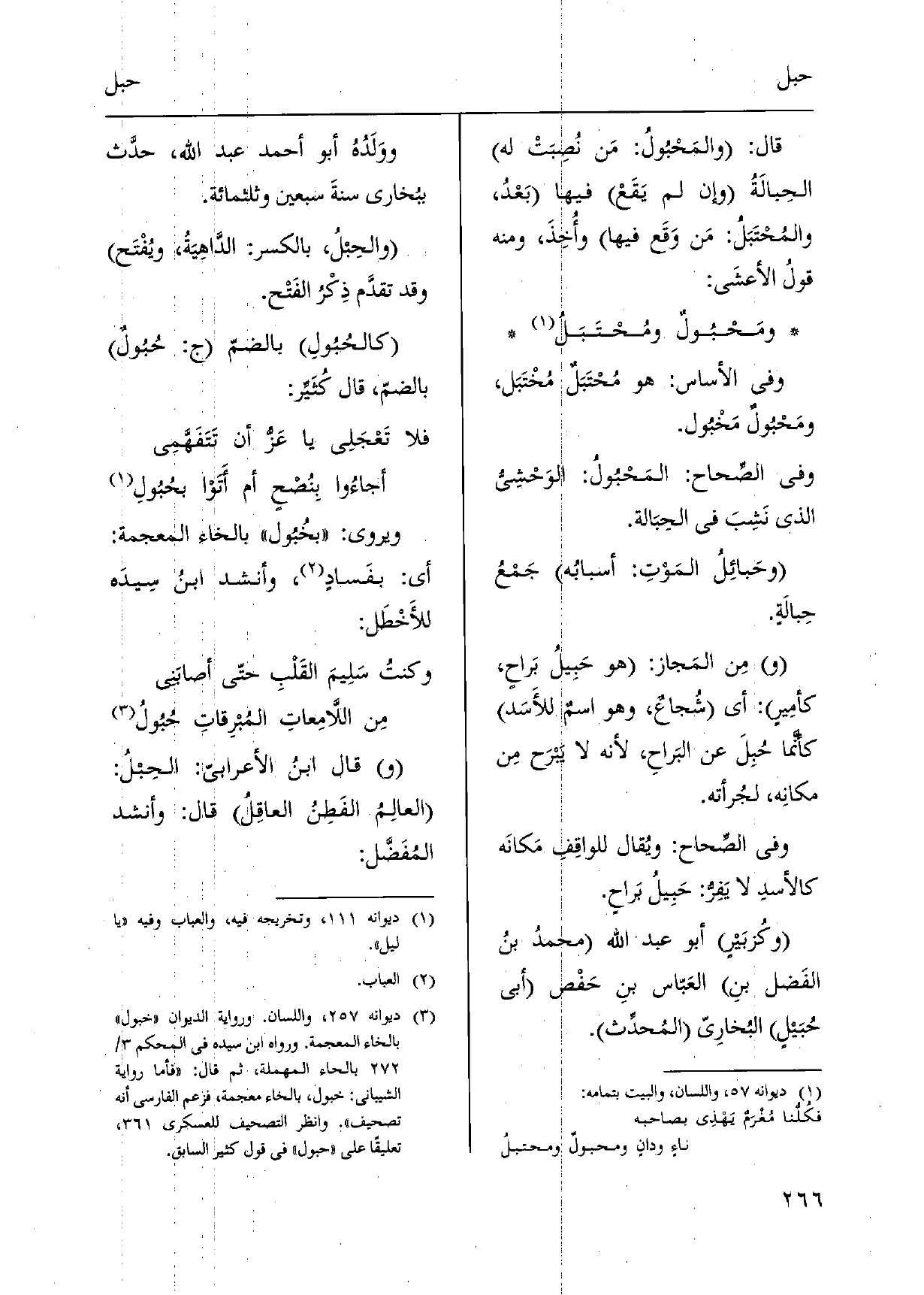 قَالَ: والمَحْبُولُ: مَن نُصِبَتْ لَهُ الحِبالَةُ وَإِن لم يَقَعْ فِيهَا بَعْدُ، والمُحْتَبَلُ: مَن وَقَع فِيهَا وأُخِذَ، وَمِنْه قولُ الأعشَى: ومَحْبُولٌ ومُحْتَبَلُ وَفِي الأساس: هُوَ مُحْتَبَلٌ مُخْتَبَل، ومَحْبُولٌ مَخْبُول. وَفِي الصِّحاح: المَحْبُولُ: الوَحْشِيُّ الَّذِي نَشِبَ فِي الحِبَالة. وحَبائِلُ المَوْتِ: أسبابُه جَمْعُ حِبالَةٍ. مِن المَجاز: هُوَ حَبِيلُ بَراحٍ، كأمِيرٍ: أَي شُجاعٌ، وَهُوَ اسمٌ للأَسَد كَأَنَّمَا حُبِلَ عَن البَراحِ، لِأَنَّهُ لَا يَبرَح مِن مكانِه، لجُرأته. وَفِي الصِّحاح: ويُقال للواقِفِ مَكانَه كالأسدِ لَا يَفِرُّ: حَبِيلُ بَراحٍ. وكُزبَيرٍ أَبُو عبد الله محمدُ بنُ الفَضل بنِ العَبّاس بنِ حَفْص أبي حُبَيلٍ البُخارِيّ المُحدِّث. ووَلَدُهُ أَبُو أَحْمد عبد الله، حدَّث ببُخارى سنةَ سبعين وثلثمائة. والحِبلُ، بِالْكَسْرِ: الدَّاهِيَةُ، ويُفْتَح وَقد تقدَّم ذِكْرُ الفَتْح. كالحُبُولِ بالضمّ ج: حُبُولٌ بالضمّ، قَالَ كُثَيِّر: