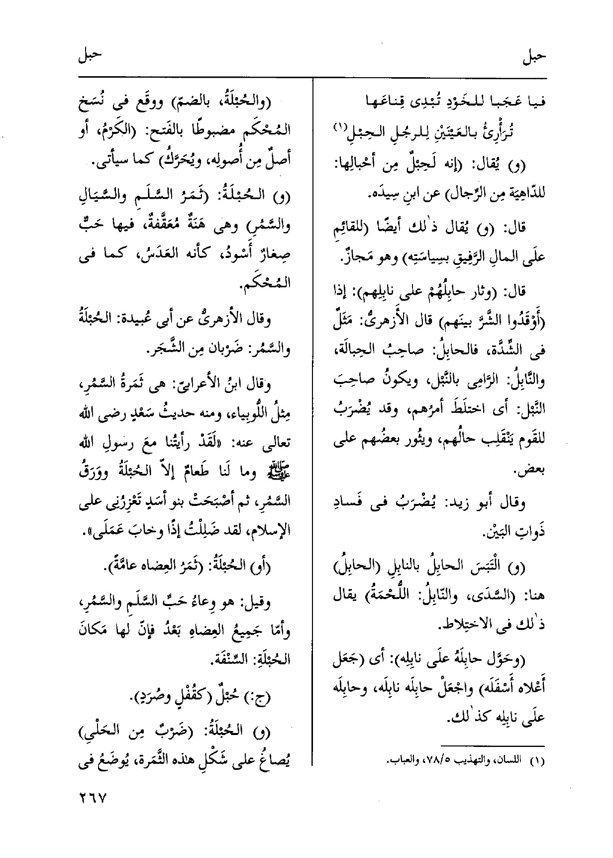يُقال: إِنَّه لَحِبْلٌ مِن أحْبالِها: للدّاهِيَة مِن الرِّجال عَن ابنِ سِيدَه. قَالَ: يُقال ذَلِك أَيْضا للقائِمِ علَى المالِ الرَّفِيقِ بسِياسَتِه وَهُوَ مَجازٌ. قَالَ: وثار حابِلُهُم على نابِلِهم: إِذا أَوْقَدُوا الشَّرَّ بينَهم قَالَ الأَزهر: مَثَلٌ فِي الشِّدَّة، فالحابِلُ: صاحبُ الحِبالَة، والنَّابِلُ: الرَّامِي بالنَّبل، ويكونُ صاحِبَ النَّبل: أَي اختلَطَ أمرُهم، وَقد يُضْرَبُ للقَوم يَنْقَلِب حالُهم، ويثور بعضُهم على بعض. وَقَالَ أَبُو زيد: يُضْرَبُ فِي فَسادِ ذَواتِ البَين. الْتَبَسَ الحابِلُ بالنابِلِ الحابِلُ هُنَا: السَّدَى، والنّابِلُ: اللُّحْمَةُ يُقَال ذَلِك فِي الاختِلاط. وحَوَّل حابِلَهُ علَى نابِلِه: أَي جَعَل أَعْلاه أَسْفَلَه واجْعَلْ حابِلَه نابِلَه، وحابِلَه علَى نابِلِه كَذَلِك. والحُبلَةُ، بالضمّ ووقَع فِي نُسَخ المُحْكَم مضبوطاً بالفَتح: الكَرْمُ، أَو أصلٌ مِن أُصولِه، ويُحَرَّكُ كَمَا سَيَأْتِي. الحُبلَةُ: ثَمَرُ السَّلَمِ والسَّيَالِ والسَّمُرِ وَهِي هَنَةٌ مُعَقَّفةٌ، فِيهَا حَبٌّ صِغارٌ أَسْودُ، كَأَنَّهُ العَدَسُ، كَمَا فِي المُحْكَم. وَقَالَ الأزهريُّ عَن أبي عُبيدة: الحُبلَةُ والسَّمُر: ضَرْبان مِن الشَّجَر. وَقَالَ ابْن الأعرابيّ: هِيَ ثَمَرةُ السَّمُرِ، مِثلُ اللُّوبياء، وَمِنْه حديثُ سَعْدٍ رَضِي الهّ تَعَالَى عَنهُ: لَقَدْ رأيتُنا معَ رسولِ الله صلى الله عَلَيْهِ وَسلم وَمَا لَنا طَعامٌ إلاّ الحُبلَةُ ووَرَقُ السَّمُرِ، ثمَّ أصْبَحَتْ بَنو أسَدٍ تَعْزِرُني على الْإِسْلَام، لقد ضَلِلتُ إِذا وخابَ عَمَلَي.