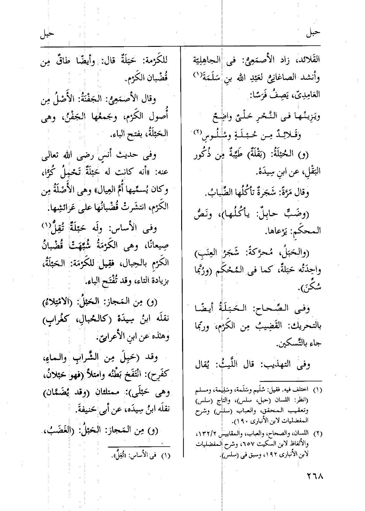 وَفِي حَدِيث أنسٍ رَضِي الّه تَعَالَى عَنهُ: أَنه كَانَت لَهُ حَبلَةٌ تَحْمِلُ كُرّاً، وَكَانَ يُسمِّيها أُمَّ العِيال وَهِي الأَصْلَةُ مِن الكَرْم، انتشَرتْ قُضْبانُها على عَرائشِها. وَفِي الأساس: ولَه حَبلَةٌ تُقِلُّ صِيعاناً، وَهِي الكَرْمَةُ شُبهَتْ قُضْبانُ الكَرمِ بالحِبال، فقِيل للكَرمَة: الحَبلَةُ، بِزِيَادَة التَّاء، وَقد تُفْتَح الْبَاء. مِن المَجاز: الحَبلُ: الامْتِلاءُ نقلَه ابنُ سِيدَهْ كالحُبالِ، كغُرابٍ هَذِه عَن ابنِ الأعربي. وَقد حَبِلَ مِن الشرابِ والماءِ، كفَرِح: انْتَفَخ بَطْنُه وامتلأ فَهُوَ حَبلانُ، وَهِي حَبلَى: ممتلئان وَقد يُضَمَّان نقلَه ابنُ سِيدَه، عَن أبي حَنيفةَ. مِن المَجاز: الحَبلُ: الغَضَبُ،