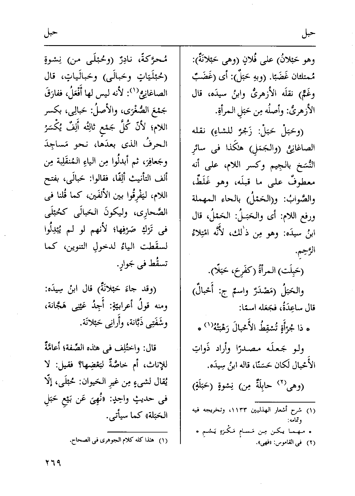 وَهُوَ حَبلانُ على فُلانٍ وَهِي حَبلانَةٌ: مُمتلئان غَضَباً. وبهِ حَبَلٌ: أَي غَضَبٌ وغَمٌّ نقلَه الأزهريُّ وابنُ سيدَه، قَالَ الأزهريُّ: وأصلُه مِن حَبَلِ المرأةِ. وحَبَلْ حَبَلْ: زَجْرٌ للشاءِ نَقله الصاغانيّ والجَمَلِ هَكَذَا فِي سائرِ النسَخ بالجِيم وَكسر اللَّام، على أَنه معطوفٌ على مَا قبلَه، وَهُوَ غَلَطٌ، والصَّوابُ: الحَمْل بِالْحَاء الْمُهْملَة وَرفع اللَّام: أَي والحَبَلُ: الحَمْلُ، قَالَ ابنُ سيدَه: وَهُوَ مِن ذَلِك، لأَنَّه امْتِلاءُ الرَحِمِ. حَبِلَت المرأةُ كفَرِحَ، حَبَلاً. والحَبَلُ مَصْدَرٌ واسمٌ ج: أَحْبالٌ قَالَ ساعِدَةُ، فجَعَله اسْما: ذَا جُرْأَةٍ تُسقِطُ الأَحْبالَ رَهْبَتُهُ وَلَو جَعلَه مصدرا وَأَرَادَ ذَواتِ الأَحْبال كَانَ حَسَناً، قَالَه ابنُ سِيدَه. وَهِي حابِلَةٌ مِن نِسوةٍ حَبَلَةٍ مُحرَّكةً، نادِرٌ وحُبلَى من نِسوةٍ حُبْلَيَاتٍ وحَبالَى وحَبالَياتٍ، قَالَ الصَّاغَانِي: لِأَنَّهُ لَيْسَ لَهَا أَفْعَلُ، ففارَقَ جَمْعَ الصّغْرَى، والأصلُ: حَبالِى، بِكَسْر اللَّام، لأنّ كُلَّ جَمْعٍ ثالِثُه أَلِفٌ يُكْسَرُ الحرفُ الَّذِي بعدَها، نَحْو مَساجِدَ وجَعافِرَ، ثمَّ أبدلُوا مِن الياءِ المُنقَلِبة مِن ألف التَّأْنِيث ألِفاً، فَقَالُوا: حَبالَى، بِفَتْح اللَّام، ليَفْرِقُوا بَين الألفَين، كَمَا قُلنا فِي الصَّحارِى، وليكونَ الحَبالَى كحُبلَى فِي تَركِ صَرْفِها، لأَنهم لَو لم يُبدِلُوا لسقَطت الياءُ لدخولِ التَّنْوِين، كَمَا تسقُط فِي جَوارٍ. وَقد جاءَ حَبلانَةٌ قَالَ ابنُ سِيدَه: وَمِنْه قولُ أعرابيّةٍ: أَجِدُ عَيني هَجَّانة، وشَفَتِي ذَبَّانة، وأَراني حَبْلانَة.