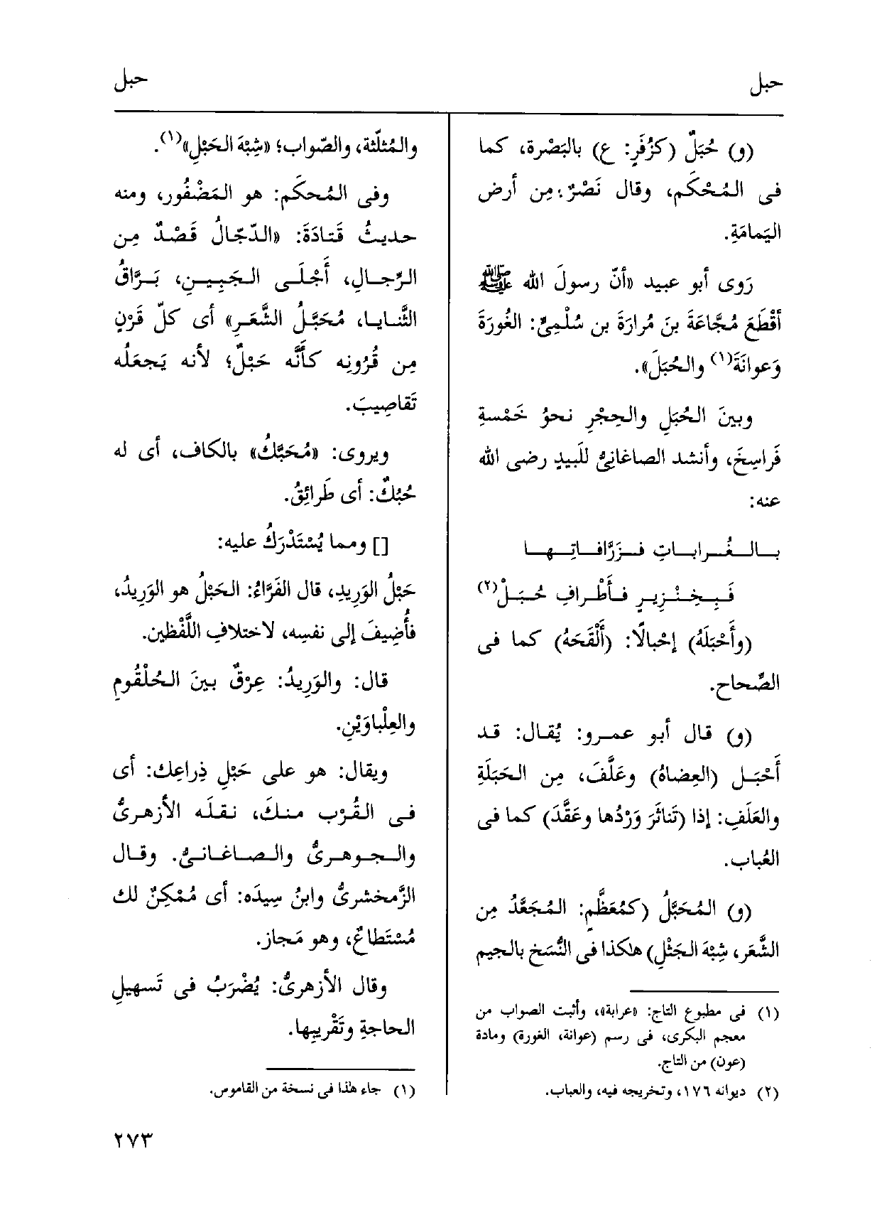 وأَحْبَلَهُ إحْبالاً: أَلْقَحَهُ كَمَا فِي الصِّحاح. قَالَ أَبُو عَمْرو: يُقال: قد أَحْبَل العِضاهُ وعَلَّفَ، مِن الحَبَلَةِ والعَلَفِ: إِذا تَناثَرَ وَرْدُها وعَقَّدَ كَمَا فِي العُباب. المُحَبَّلُ كمُعَظَّمٍ: المُجَعَّدُ مِن الشَّعَر، شِبهَ الجَثْلِ هَكَذَا فِي النًّسَخ بِالْجِيم والمُثلّثة، والصّواب شِبهَ الحَبلِ. وَفِي المُحكَم: هُوَ المَضْفُور، وَمِنْه حديثُ قَتادَةَ: الدّجّالُ قَصْدٌ مِن الرِّجالِ، أَجْلَى الجَبِينِ، بَرَّاقُ الثَّنايا، مُحَبَّلُ الشَّعَرِ أَي كلّ قَرنٍ مِن قُرُونِه كَأَنَّهُ حَبلٌ لِأَنَّهُ يَجعَلُه تَقاصِيبَ. ويروى: مُحَبَّكُ بِالْكَاف، أَي لَهُ حُبُكٌ: أَي طَرائِقُ.)