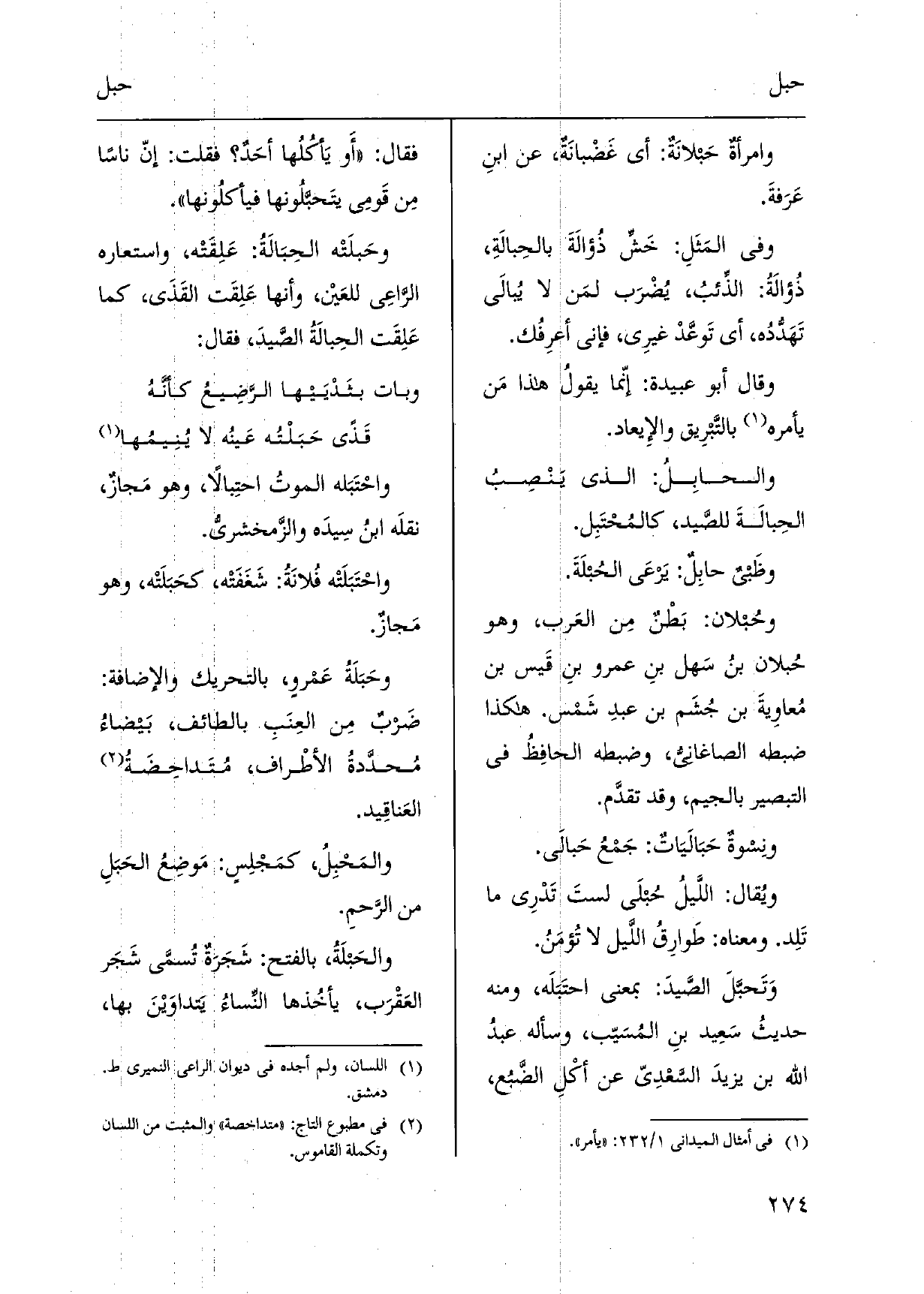 والحابِلُ: الَّذِي يَنْصِبُ الحِبالَةَ للصَّيد، كالمُحْتَبِل. وظَبيٌ حابِلٌ: يَرعَى الحُبْلَةَ. وحُبلان: بَطْنٌ مِن العَرب، وَهُوَ حُبلان بنُ سَهل بنِ عَمْرو بنِ قَيس بن مُعاوِيةَ بن جُشَم بن عبدِ شَمْس. هَكَذَا ضَبطه الصاغانيُّ، وَضَبطه الحافِظُ فِي التبصير بِالْجِيم، وَقد تقدَّم. ونِسوةٌ حَبَالَيَاتٌ: جَمْعُ حَبالَى. ويُقال: اللَّيلُ حُبلَى لستَ تَدْرِي مَا تَلِد. وَمَعْنَاهُ: طَوارِقُ اللَّيل لَا تُؤمَن. وَتَحبَّلَ الصَّيدَ: بِمَعْنى احتَبَلَه، وَمِنْه حديثُ سَعِيد بنِ المُسَيّب، وَسَأَلَهُ عبدُ الله بن يزيدَ السَّعْدِيّ عَن أكْلِ الضَّبع، فَقَالَ: أَو يَأكُلُها أحَدٌ فَقلت: إنّ نَاسا مِن قَومِي يتَحبَّلُونها فيأكلُونها. وحَبلَتْه الحِبَالَةُ: عَلِقَتْه، واستعاره الرَّاعِي للعَينْ، وَأَنَّهَا عَلِقَت القَذَى، كَمَا عَلِقَت الحِبالَةُ الصَّيدَ، فَقَالَ:
