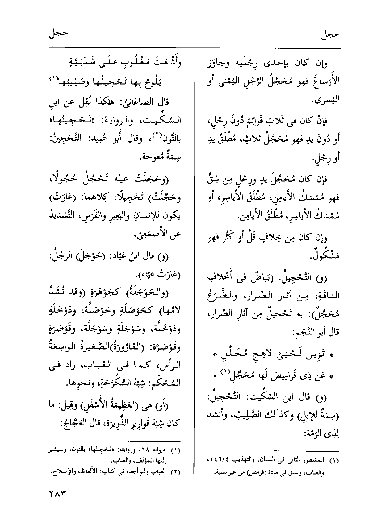 وَإِن كَانَ بِإِحْدَى رِجْلَيه وجاوَز الأَرْساغَ فَهُوَ مُحَجَّلُ الرِّجْلِ اليُمْنى أَو اليُسرى. فإنْ كَانَ فِي ثَلاثِ قَوائِمَ دُونَ رِجلٍ، أَو دُونَ يدٍ فَهُوَ مُحَجَّلُ ثلاثٍ، مُطْلَقُ يدٍ أَو رِجلٍ. فَإِن كَانَ مُحَجَّلَ يدٍ ورِجْلٍ مِن شِق فَهُوَ مُمْسَكُ الأيامِنِ، مطْلَقُ الأياسِرِ، أَو مُمْسَكُ الأياسِرِ، مُطْلَقُ الأيامِن. وَإِن كَانَ مِن خِلافٍ قَلَّ أَو كَثُر فَهُوَ مَشْكولٌ. التَّحْجِيلُ: بَياضٌ فِي أَخْلافِ الناقَةِ، مِن آثَار الصِّرار، والضَّرعُ مُحَجَّلٌ: بِهِ تَحْجِيلٌ مِن آثارِ الصِّرار، قَالَ أَبُو النَّجْم: تَزِين لَحْيَىْ لاهِجٍ مُخَلَّلِ عَن ذِي قَرامِيصَ لَها مُحَجَّلِ قَالَ ابْن السِّكِّيت: التَّحْجِيلُ: سِمَةٌ للإبِلِ وَكَذَلِكَ الصَّلِيبُ، وَأنْشد لِذِي الرّمّة: