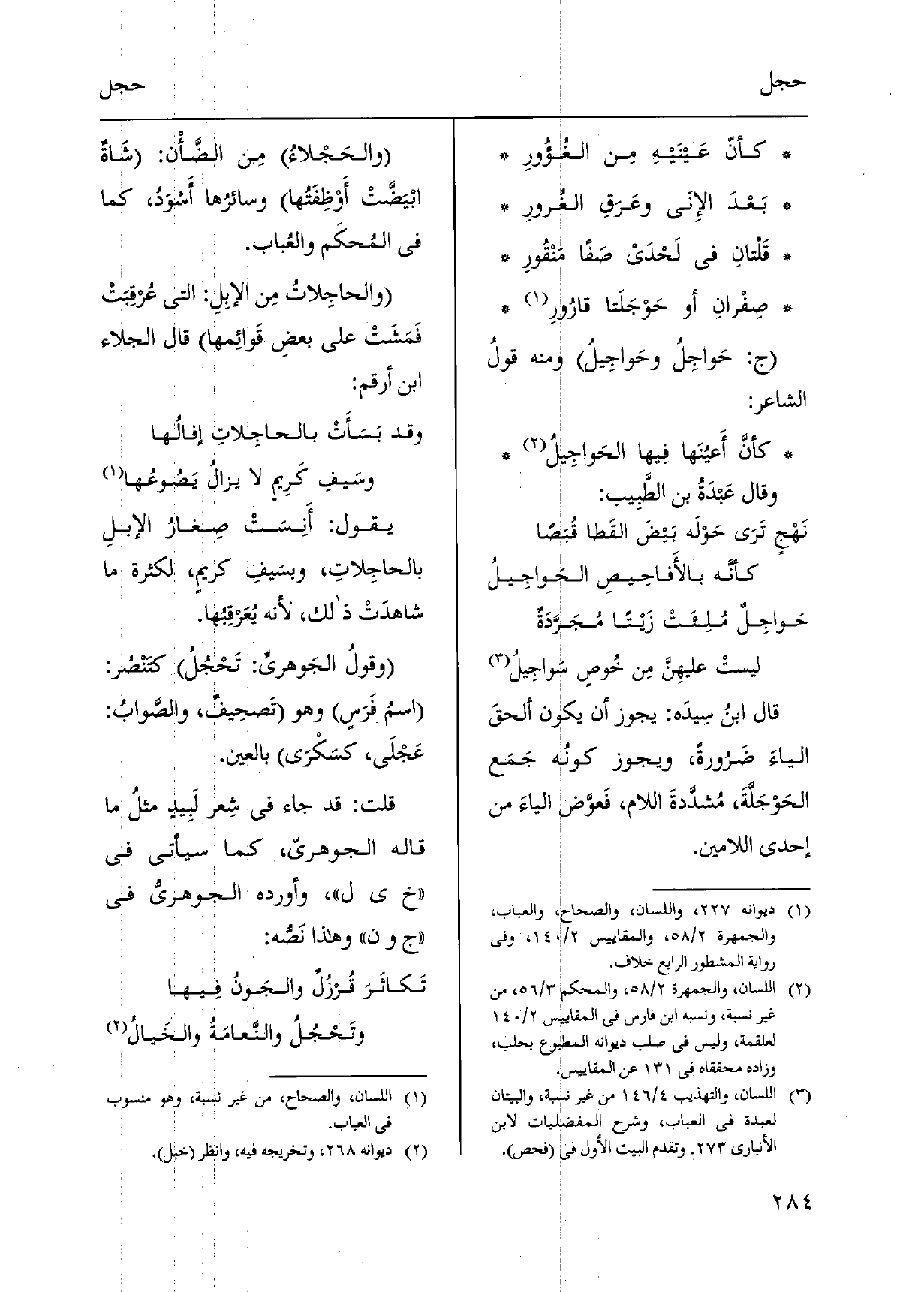 قَالَ ابنُ سِيدَه: يجوز أَن يكون ألحقَ الياءَ ضَرُورةً، وَيجوز كونُه جَمَع الحَوْجَلَّةَ، مُشدَّدةَ اللَّام، فَعوَّض الياءَ من إِحْدَى اللامين. والحَجْلاءُ مِن الضَّأْن: شَاةٌ ابْيَضتْ أَوْظِفَتُها وسائرُها أَسْوَدُ، كَمَا فِي المُحكَم والعُباب. والحاجِلاتُ مِن الإبِلِ: الَّتِي عُرقِبَتْ فَمَشَتْ على بعضِ قَوائِمها قَالَ الْجلاء ابْن أَرقم:
