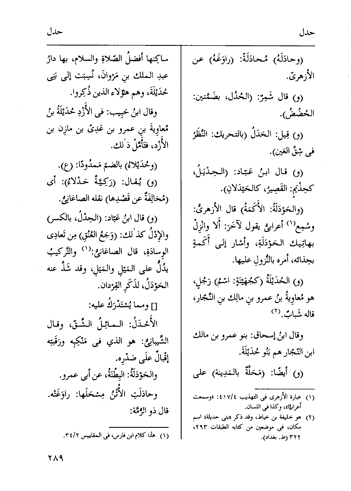 وحادَلَهُ مُحادَلَةً: راوَغَهُ عَن الْأَزْهَرِي. قَالَ شَمِرٌ: الحُدُل، بضَمَّتين: الحُضُضُ. قِيل: الحَدَلُ بِالتَّحْرِيكِ: النَّظَرُ فِي شِقِّ العَين. قَالَ ابنُ عَبّاد: الحِدْيَلُ، كحِذْيَمٍ: القَصِيرُ، كالحَيدَلانِ. والحَوْدَلَةُ: الأَكَمَةُ قَالَ الأزهريُّ: وسُمِع أعرابيُّ يَقُول لآخَرَ: أَلا وانْزِلْ بهاتِيك الحَوْدَلَةِ، وَأَشَارَ إِلَى أَكَمةٍ بحِذائه، أمره بالنُّزولِ عَلَيْهَا. الحُدَيْلَةُ كجُهَينَةٍ: اسْمُ رَجُلٍ، هُوَ مُعاوِيةُ بنُ عَمْرو بنِ مالِك بنِ النَّجّار، قَالَه شَبابٌ. وَقَالَ ابنُ إِسْحَاق: بَنو عَمْرو بن مَالك ابْن النّجّار هم بَنُو حُدَيْلَةَ. أَيْضا: مَحَلَّةٌ بالمَدِينة على ساكِنها أفضلُ الصّلاةِ وَالسَّلَام، بهَا دارُ عبدِ الْملك بنِ مَروانَ، نُسِبَت إِلَى بني حُدَيْلَةَ، وهم هَؤُلَاءِ الَّذين ذُكِروا. وَقَالَ ابْن حَبِيب: فِي الأَزْدِ حُدَيْلَةُ بنُ مُعاوِيةَ بنِ عَمْرو بن عَدِيّ بن مازِن بن الأَزْد، فتَأَمَّلْ ذَلِك.