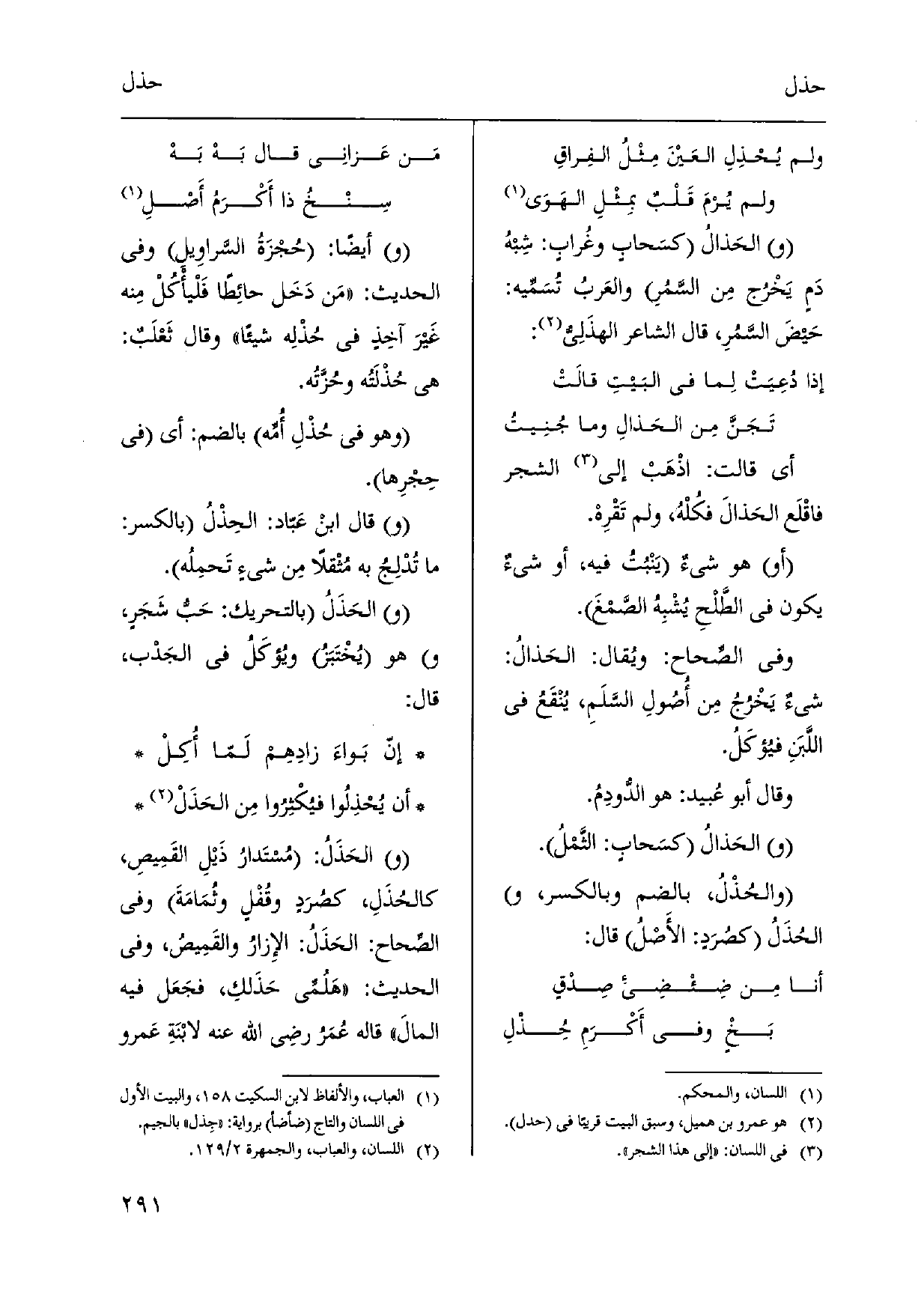 أَي قَالَت: اذْهَبْ إِلَى الشّجر فاقْلَع الحَذالَ فكُلْا، وَلم تَقْرِهْ. أَو هُوَ شَيْء يَنْبُتُ فِيهِ، أَو شَيْء يكون فِي الطَّلْحِ يُشْبِهُ الصَّمْغَ. وَفِي الصِّحاح: ويُقال: الحَذالُ: شَيْء يَخْرُجُ مِن أصُولِ السَّلَمِ، يُنْقَعُ فِي اللَّبَنَ فيُؤكَلُ. وَقَالَ أَبُو عُبيد: هُوَ الدُّودِمُ. الحَذالُ كسَحابٍ: الثَّمْلُ. والحُذْلُ، بِالضَّمِّ وبالكسر، الحُذَلُ كصُرَدٍ: الأَصْل قَالَ: