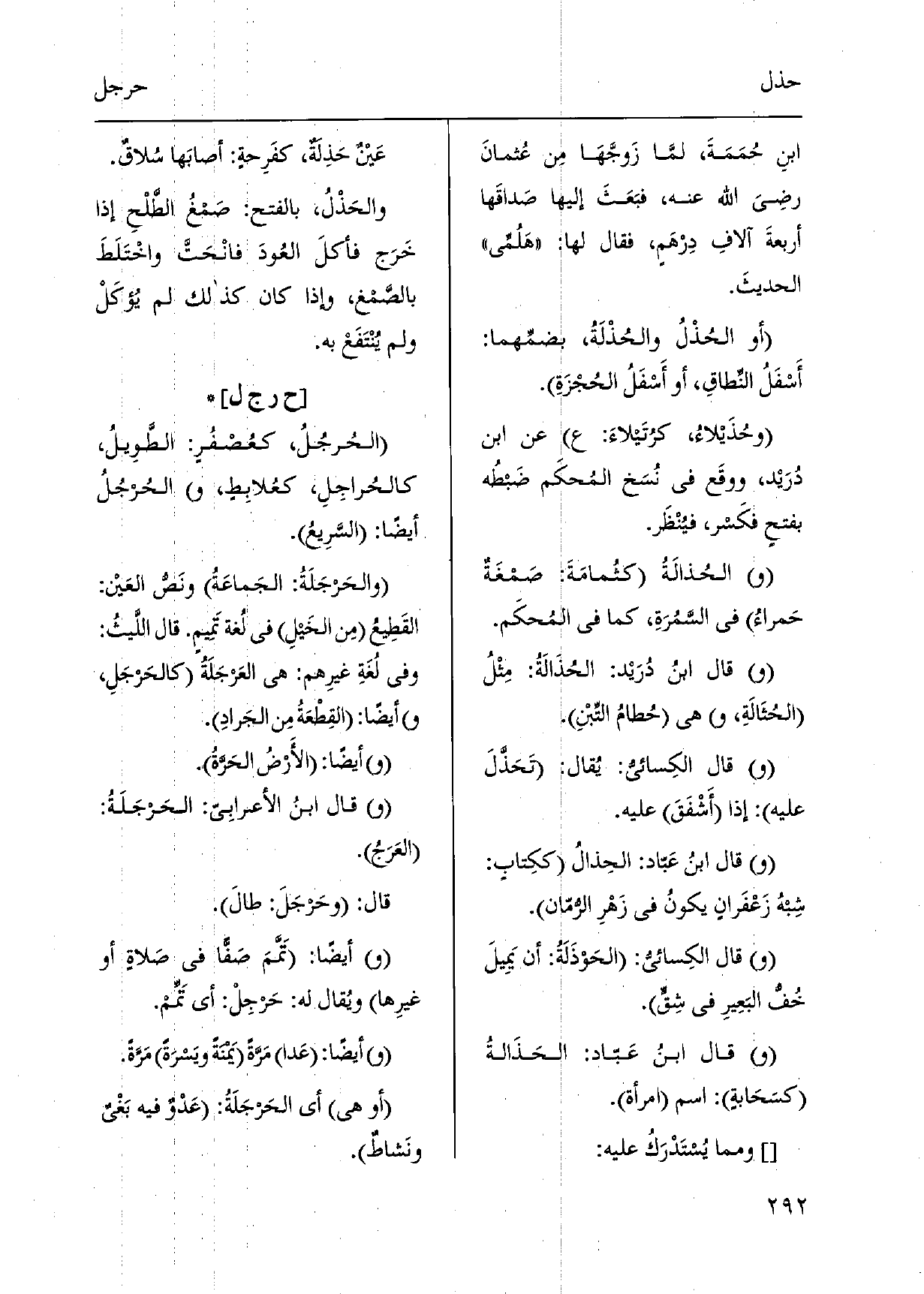 ابنِ حُمَمَةَ، لمَّا زَوجَّهَا مِن عُثمانَ رَضِي الله عَنهُ، فبَعَثَ إِلَيْهَا صَداقَها أربعةَ آلافِ دِرْهَمٍ، فَقَالَ لَهَا: هَلُمِّي الحديثَ. أَو الحُذْلُ والحُذْلَة، بضمِّهما: أَسْفَلُ النِّطاقِ، أَو أَسْفَل الحُجْزَةِ. وحُذَيْلاءُ، كرُتَيلاءَ: ع عَن ابْن دُرَيْد، ووقَع فِي نُسَخ المُحكَم ضَبطُه بفتحٍ فكَسر، فيُنْظَر. الحُذالَةُ كثُمامَةَ: صَمْغَةٌ حَمراءُ فِي السَّمُرَةِ، كَمَا فِي المُحكَم. قَالَ ابنُ دُرَيْد: الحُذَالَةُ: مِثْلُ الحُثَالَةِ، هِيَ حُطامُ التِّبن. قَالَ الكِسائي: يُقال: تَحَذَّلَ عَلَيْهِ: إِذا أَشْفَقَ عَلَيْهِ. قَالَ ابنُ عَبّاد: الحِذالُ ككِتابٍ: شِبهُ زَعْفَرانٍ يكونُ فِي زَهْرِ الرُّمّان. قَالَ الكِسائيُّ: الحَوْذَلَةُ: أَن يَمِيلَ خُفُّ البَعِيرِفي شِقٍّ. قَالَ ابنُ عَبّاد: الحَذَالةُ كسَحَابةٍ: اسْم امْرَأَة.