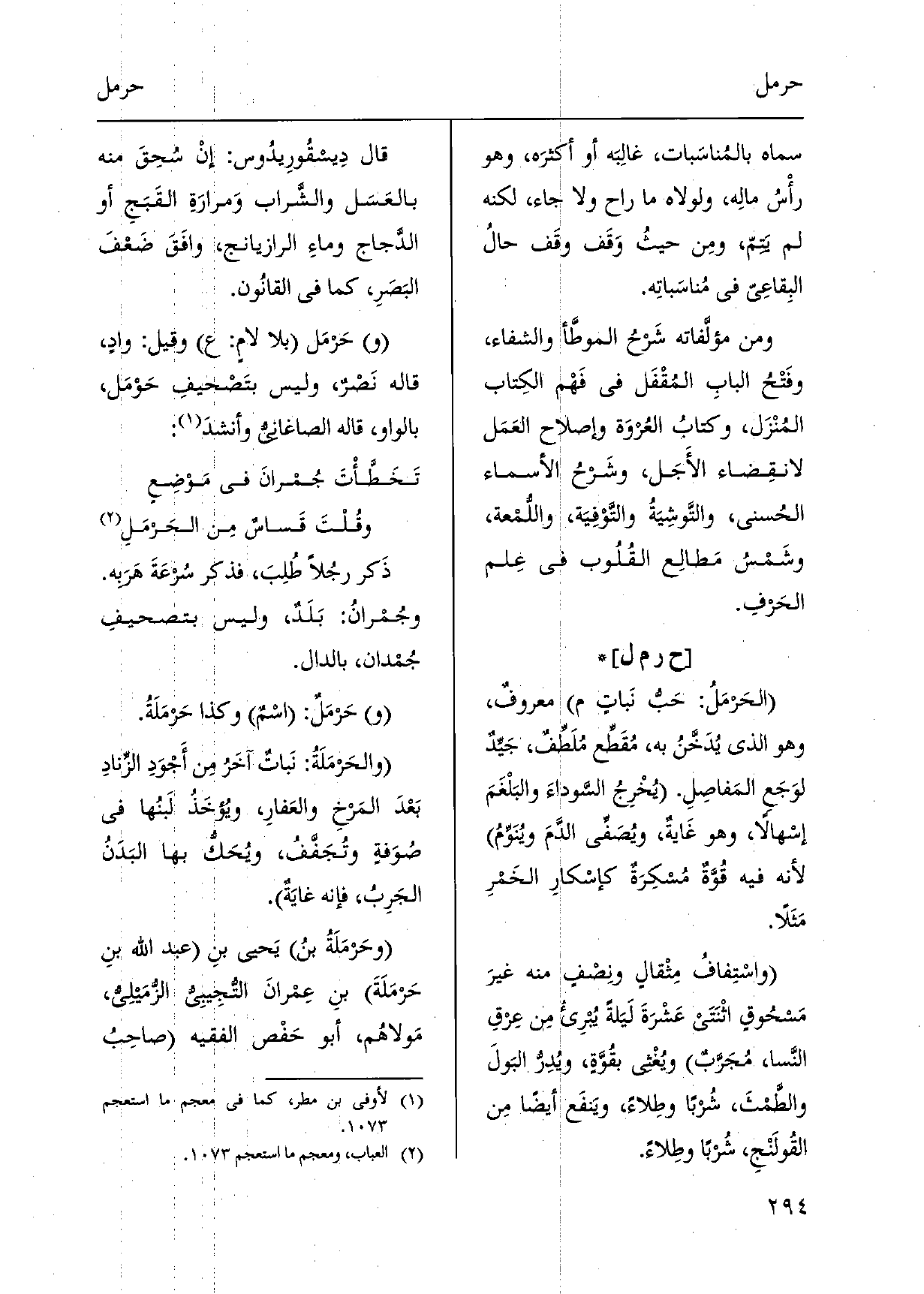 الحَرْمَلُ: حَبُّ نَباتٍ م معروفٌ، وَهُوَ الَّذِي يُدَخَّنُ بِهِ، مُقَطِّع مُلَطِّفٌ، جَيدٌ لوَجَعِ المَفاصِلِ. يُخْرِجُ السَّوداءَ والبَلْغَمَ إسْهالاً، وَهُوَ غَايةٌ، ويُصَفي الدَّمَ ويُنَومُ لِأَنَّهُ فِيهِ قُوَّةٌ مُسْكِرَةٌ كإسْكارِ الخَمْرِ مَثَلاً. واسْتِفافُ مِثْقالٍ ونِصْفٍ مِنْهُ غيرَ مَسحُوقٍ اثْنَتَي عَشْرَةَ لَيَلةً يُبرِئُ مِن عِرقِ النَّسا، مُجَرَّبٌ ويُغْثى بقُوَّةٍ، ويُدِرُّ البَولَ والطَّمْثَ، شُرباً وطِلاءً، ويَنفَع أَيْضا مِن القُولَنْج، شُرباً وطِلاءً. قَالَ دِيسقُورِيدُوس: إنْ سُحِقَ مِنْهُ بالعَسَل والشَّراب وَمرارَةِ القَبَجِ أَو الدَّجاج وماءِ الرازيانج، وافَقَ ضَعْفَ البَصَرِ، كَمَا فِي القانُون. حَرْمَل بِلَا لامٍ: ع وَقيل: وادٍ، قَالَه نَصْرٌ، وَلَيْسَ بتَصْحيفِ حَوْمَل، بِالْوَاو، قَالَه الصَّاغَانِي وأنشدَ: