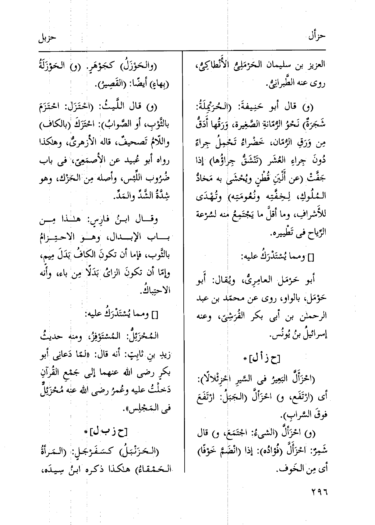 احْزَأَلَّ البَعِيرُ فِي السَّيرِ احْزِئْلالاً: أَي ارْتَفَع، حْزَألَّ الجَبَل: ارْتَفَعَ فوقَ السَّرابِ. احْزَألَّ الشَّيْء: اجْتَمَعَ، قَالَ شَمِرٌ: احْزَأَلَّ فُؤادُه: إِذا انْضَمَّ خَوْفاً أَي مِن الخَوف. والحَوْزَلُ كجَوْهَرٍ. الحَوْزَلَةُ بِهاءٍ أَيْضا: القَصِيرُ. قَالَ اللَّيثُ: احْتَزَل: احْتَزَمَ بالثَّوبِ، أَو الصَّوابُ: احْتَزَكَ بِالْكَاف واللّامُ تَصحيفٌ، قَالَه الأزهريُّ، وهكهذا رَوَاهُ أَبُو عُبيد عَن الأصمَعِي، فِي بَاب ضُرُوب اللِّبس، وَأَصله مِن الحَزْك، وَهُوَ شِدَّةُ الشَّدِّ والمَدِّ. وَقَالَ ابنُ فارِسٍ: هَذَا مِن بَاب الْإِبْدَال، وَهُوَ الاحتِزامُ بالثَّوب، فإمَّا أَن تكونَ الكافُ بَدَلَ مِيمٍ، وإمّا أَن تكونَ الزَّاي بَدَلاً مِن بَاء، وَأَنه الاحتِباكُ.