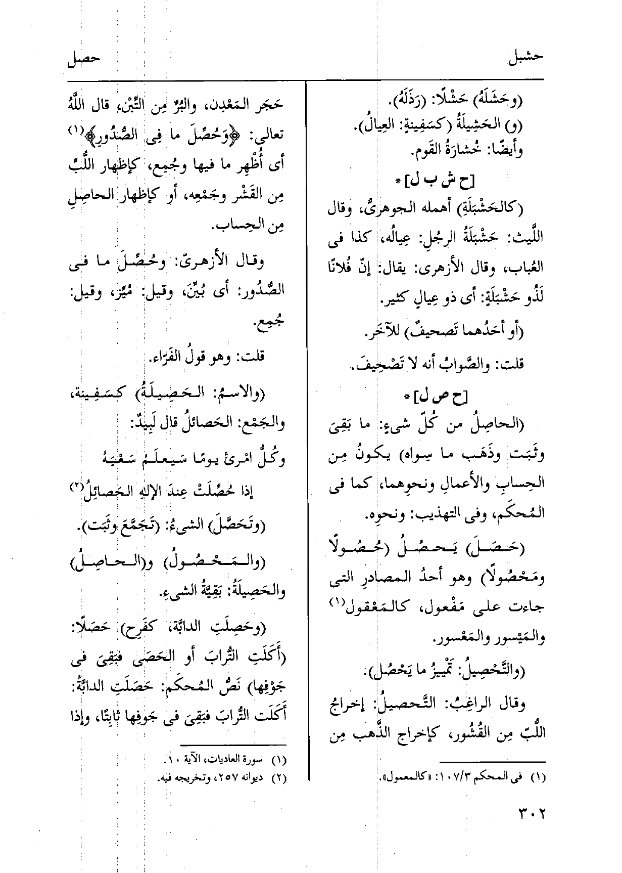 الحاصِلُ من كُلّ شَيْء: مَا بَقِىَ وثَبَت وذَهَب مَا سِواه يكونُ مِن الحِسابِ والأعمالِ ونحوِهما، كَمَا فِي المُحكَم، وَفِي التَّهْذِيب: ونحوِه. حَصَلَ يَحصُلُ حُصُولاً ومَحْصُولاً وَهُوَ أحدُ المصادرِ الَّتِي جَاءَت عَليّ مَفْعول، كالمَعْقول والمَيسور والمَعْسور. والتَّحْصِيلُ: تَمْييزُ مَا يَحْصُل. وَقَالَ الراغِبُ: التَّحصيلُ: إخراجُ اللُّبّ مِن القُشُور، كإخراج الذَّهب مِن حَجَر المَعْدِن، والبُرِّ مِن التِّبنْ، قَالَ اللَّهُ تَعَالَى: وَحُصِّلَ مَا فِي الصُّدُورِ أَي أظْهر مَا فِيهَا وجُمِع، كإظهار اللُّبِّ مِن القَشْر وجَمْعِه، أَو كإظهار الحاصِلِ مِن الحِساب. وَقَالَ الأزهريُّ: وحُصِّلَ مَا فِي الصُّدُور: أَي بُيِّنَ، وَقيل: مُيِّز، وَقيل: جُمِع. قلت: وَهُوَ قولُ الفَرّاء. والاسمُ: الحَصِيلَةُ كسَفِينة، والجَمْع: الحَصائلُ قَالَ لَبِيدٌ: