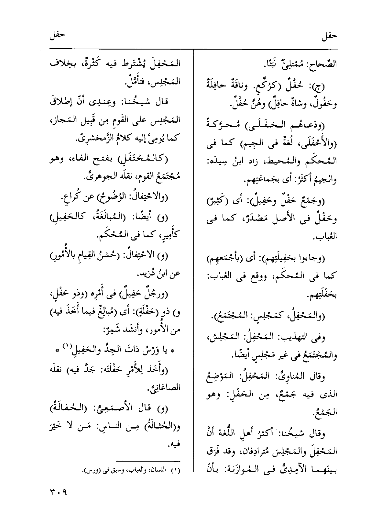الصِّحاح: مُمْتلِئ لَبَناً. ج: حُفَّلٌ كرُكَّع. وناقَةٌ حافِلَةٌ وحَفُولٌ، وشاةٌ حافِلٌ وهُنَّ حُفَّلٌ. ودَعاهُم الحَفَلَى مُحرَّكةً والأَحْفَلَى، لُغةٌ فِي الجِيم كَمَا فِي المُحكَم والمُحيط، زَاد ابنُ سِيدَه: والجيمُ أكثَرُ: أَي بجَماعَتِهم. وجَمْعٌ حَفْلٌ وحَفِيلٌ: أَي كَثِيرٌ وحَفْلٌ فِي الأَصْل مَصْدَرٌ، كَمَا فِي العُباب. وَجَاءُوا بحَفِيلَتِهم: أَي بأجْمَعهِم كَمَا فِي المُحكَم، وَوَقع فِي العُباب: بحَفْلَتِهم. والمَحْفِلُ، كمَجْلِسٍ: المُجْتَمَعُ. وَفِي التَّهْذِيب: المَحْفِلُ: المَجْلِسُ، والمُجْتَمَعُ فِي غير مَجْلِسٍ أَيْضا. وَقَالَ المُناوِيُّ: المَحْفِلُ: المَوْضِعُ الَّذِي فِيهِ جَمْعٌ، مِن الحَفْلِ: وَهُوَ الجَمْعُ. وَقَالَ شيخُنا: أكثرُ أهلِ اللُّغة أنَّ المَحْفِلَ والمَجْلِسَ مُترادِفان، وَقد فَرَق بينَهما الآمِدِيُّ فِي المُوازَنة: بأنّ المَحْفِلَ يُشْتَرط فِيهِ كَثْرةٌ، بخِلاف المَجْلِس، فتأَمَّلْ. قَالَ شيخُنا:)