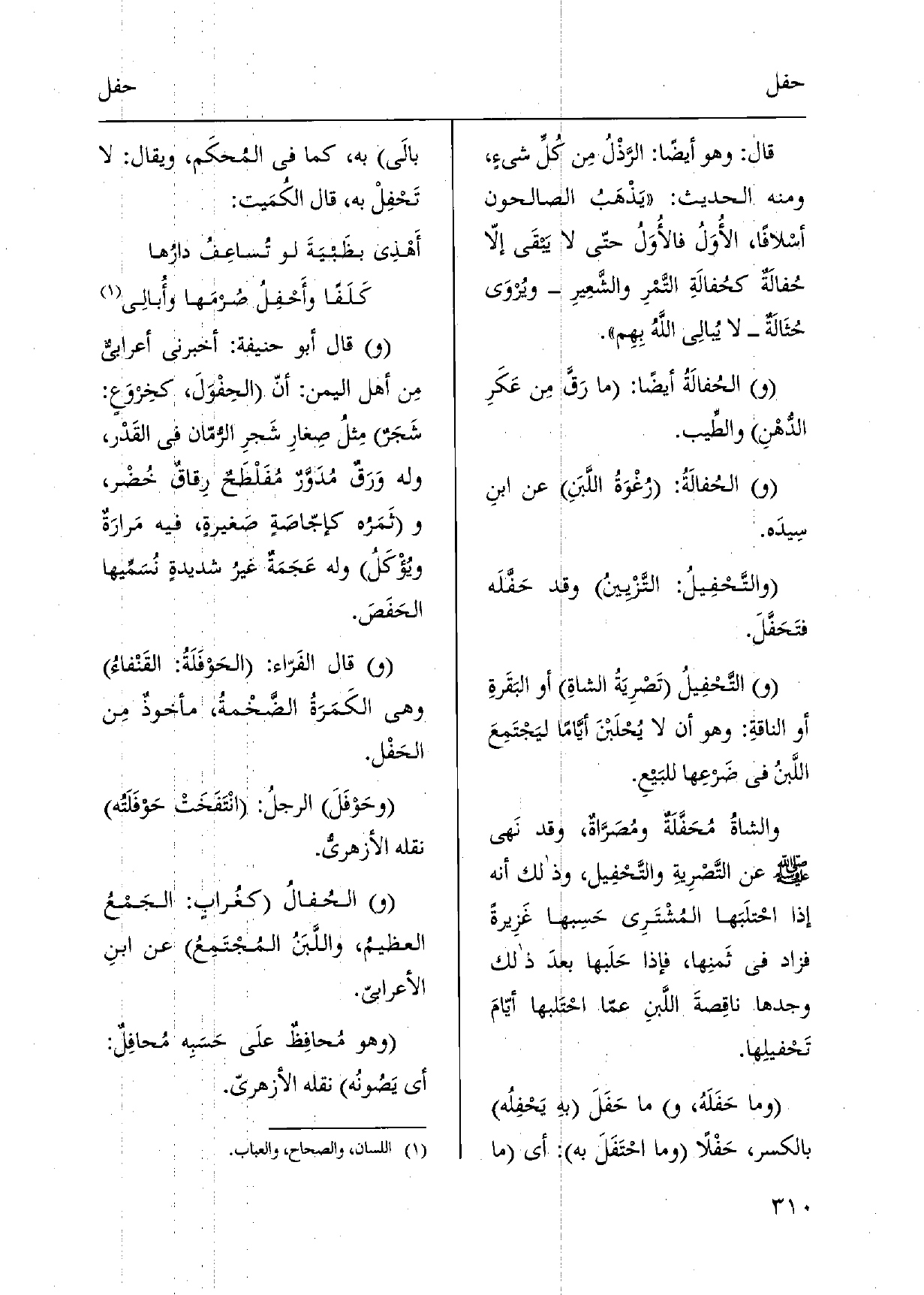 قَالَ أَبُو حنيفَة: أَخْبرنِي أعرابيٌّ مِن أهل الْيمن: أنّ الحِفْوَلَ، كخِروَعٍ: شَجَرٌ مِثلُ صِغارِ شَجرِ الرُّمّان فِي القَدْر، وَله وَرَقٌ مُدَوَّرٌ مُفَلْطَحٌ رِقاقٌ خُضْر، ثَمَرُه كإجّاصَةٍ صَغيرةٍ، فِيهِ مَرارَةٌ ويُؤْكَلُ وَله عَجَمَةٌ غيرُ شديدةٍ نُسَمِّيها الحَفَصَ. قَالَ الفَرّاء: الحَوْفَلَةُ: القَنْفاءُ وَهِي الكَمَرَةُ الضَّخْمةُ، مأخوذٌ مِن الحَفْل. وحَوْفَلَ الرجلُ: انْتَفَخَتْ حَوْفَلَتُه نَقله الأزهريُّ. الحُفالُ كغُرابٍ: الجَمْعُ العظيمُ، واللَّبَنُ المُجْتَمِعُ عَن ابنِ الأعرابيّ. وَهُوَ مُحافِظٌ على حَسَبِه مُحافِلٌ: أَي يَصُونُه نَقله الأزهريُّ.