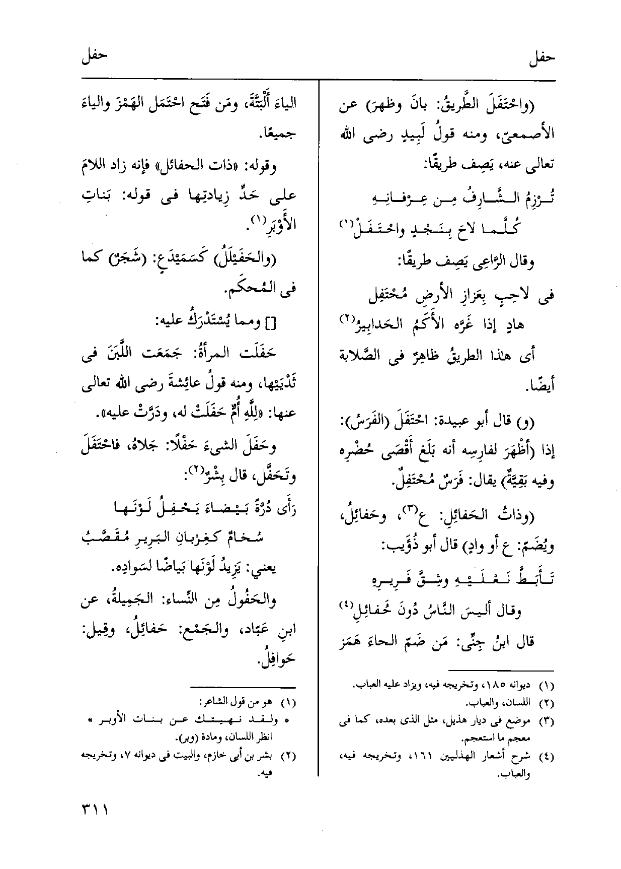 قَالَ ابنُ جِنِّي: مَن ضَمّ الحاءَ هَمَز الياءَ أَلْبَتَّةَ، ومَن فَتَح احْتَمَل الهَمْزَ والياءَ جَمِيعًا. وَقَوله: ذَات الحفائل فَإِنَّهُ زَاد اللامَ على حَدِّ زِيادتِها فِي قَوْله: بَناتِ الأَوْبَرِ. والحَفَيلَلُ كَسَمَيدَعٍ: شَجَرٌ كَمَا فِي المُحكَم.