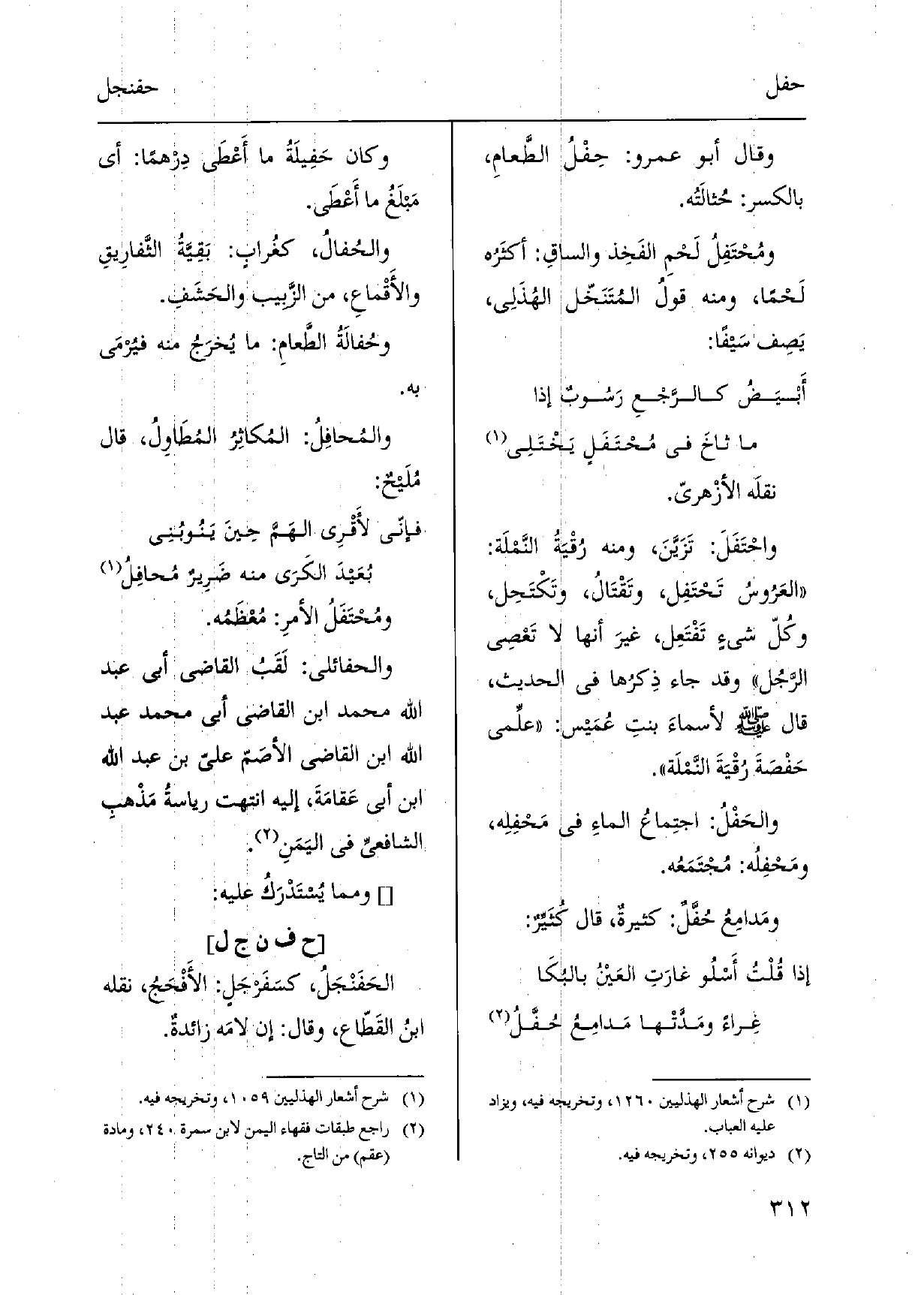 وَقَالَ أَبُو عَمْرو: حِفْلُ الطَّعامِ، بِالْكَسْرِ: حُثالَتُه. ومُحْتَفِل لَحْمِ الفَخِذ والساقِ: أكثَرُه لَحْماً، وَمِنْه قولُ المتَنَخّل الهُذَلِي، يَصِف سَيفاً:
