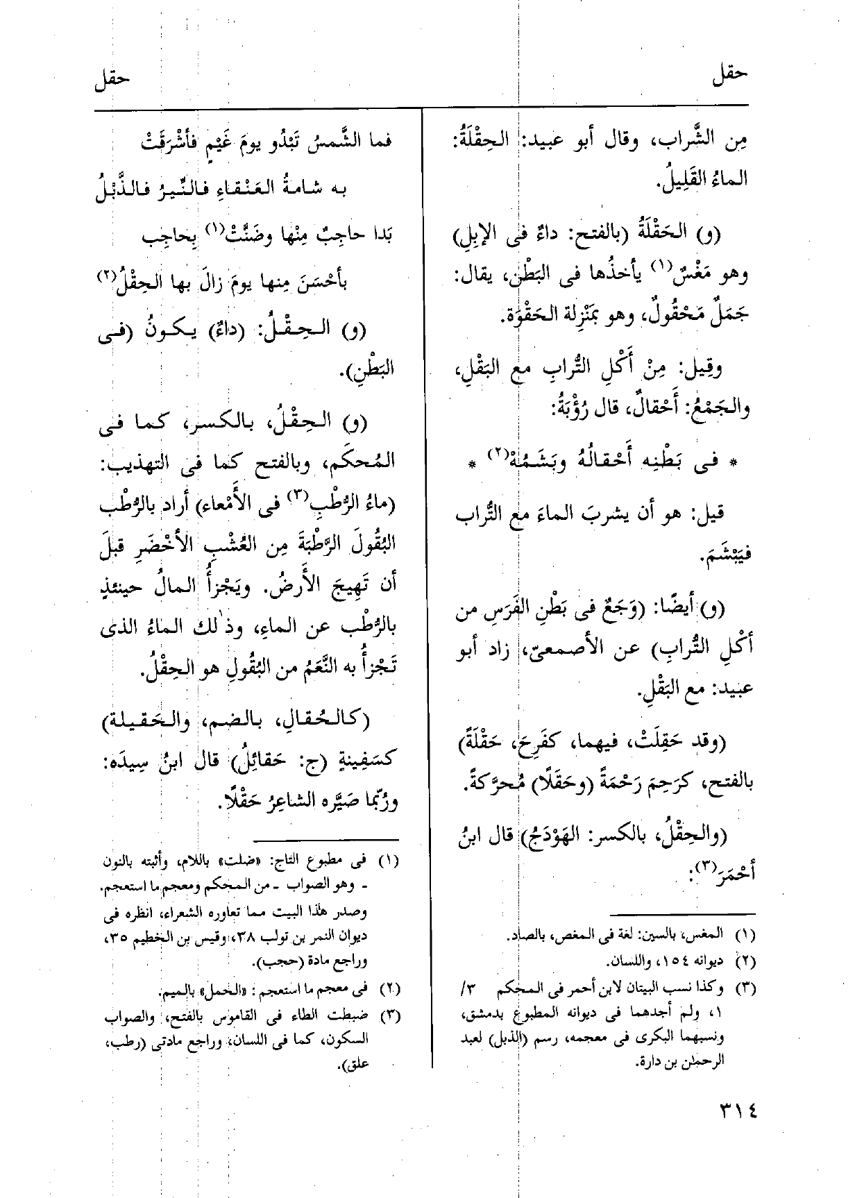 مِن الشَّراب، وَقَالَ أَبُو عبيد: الحِقْلَةُ: الماءُ القَلِيلُ. الحَقْلَةُ بِالْفَتْح: داءٌ فِي الإبِلِ وَهُوَ مَغْسٌ يأخذُها فِي البَطْن، يُقَال: جَمَل مَحْقُولٌ، وَهُوَ بمَنْزِلة الحَقْوَة. وقِيل: مِنْ أَكْلِ التُّرابِ مَعَ البَقْلِ، والجَمْعُ: أَحْقالٌ، قَالَ رُؤْبَةُ: فِي بَطْنِه أَحْقالُهُ وبَشَمُهْ قيل: هُوَ أَن يشربَ الماءَ مَعَ التُّراب فيَبشَمَ. أَيْضا: وَجَعٌ فِي بَطْنِ الفَرَسِ من أكْلِ التُّرابِ عَن الْأَصْمَعِي، زَاد أَبُو عبيد: مَعَ البَقْلِ. وَقد حَقِلَتْ، فيهمَا، كفَرِحَ، حَقْلَةً بِالْفَتْح، كرَحِمَ رَحْمَةً وحَقَلاً محرَّكةً. والحِقْلُ، بِالْكَسْرِ: الهَوْدَجُ قَالَ ابنُ أحْمَرَ:)