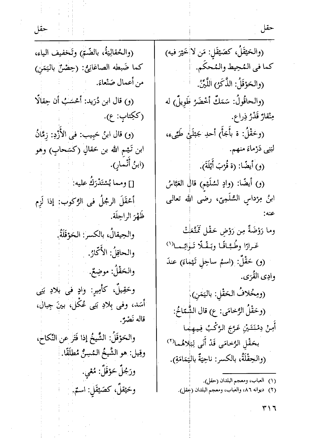 حَقْلٌ: اسمُ ساحِلِ تَيماءَ عندَ وادِي القُرَى. ومِخْلافُ الحَقْلِ: باليَمَنِ. وحَقْلُ الرُّخامَى: ع قَالَ الشَّمّاخ:)