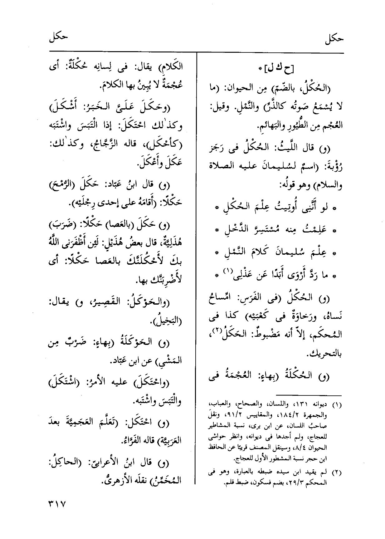 الحُكْلُ، بالضّمّ مِن الْحَيَوَان: مَا لَا يُسمَعُ صَوتُه كالذَّرِّ والنَّمْلِ. وَقيل: العُجْم مِن الطيُورِ والبَهائمِ. قَالَ اللَّيثُ: الحُكْلُ فِي رَجَز رُؤْبةَ: اسمٌ لسُليمانَ عَلَيْهِ الصَّلَاة وَالسَّلَام وَهُوَ قولُه: لَو أَنَّنِي أُوتِيتُ عِلْمَ الحُكْلِ عَلِمْتُ مِنه مُستَسِرَّ الدَّخْلِ عِلْمَ سُليمانَ كلامَ النَّملِ مَا رَدَّ أَرْوَى أَبَداً عَن عَذْلِي الحُكْلُ فِي الفَرَسِ: امِّساحُ نَساهُ، ورَخاوَةٌ فِي كَعْبَيه كَذَا فِي المُحكَم، إلاّ أَنه مَضْبوطٌ: الحَكَلُ، بِالتَّحْرِيكِ. الحُكْلَةُ بِهاءٍ: العُجْمَةُ فِي الكلامِ يُقَال: فِي لِسانِه حُكْلَةٌ: أَي عُجْمَةٌ لَا يُبِينُ بهَا الكلامَ.