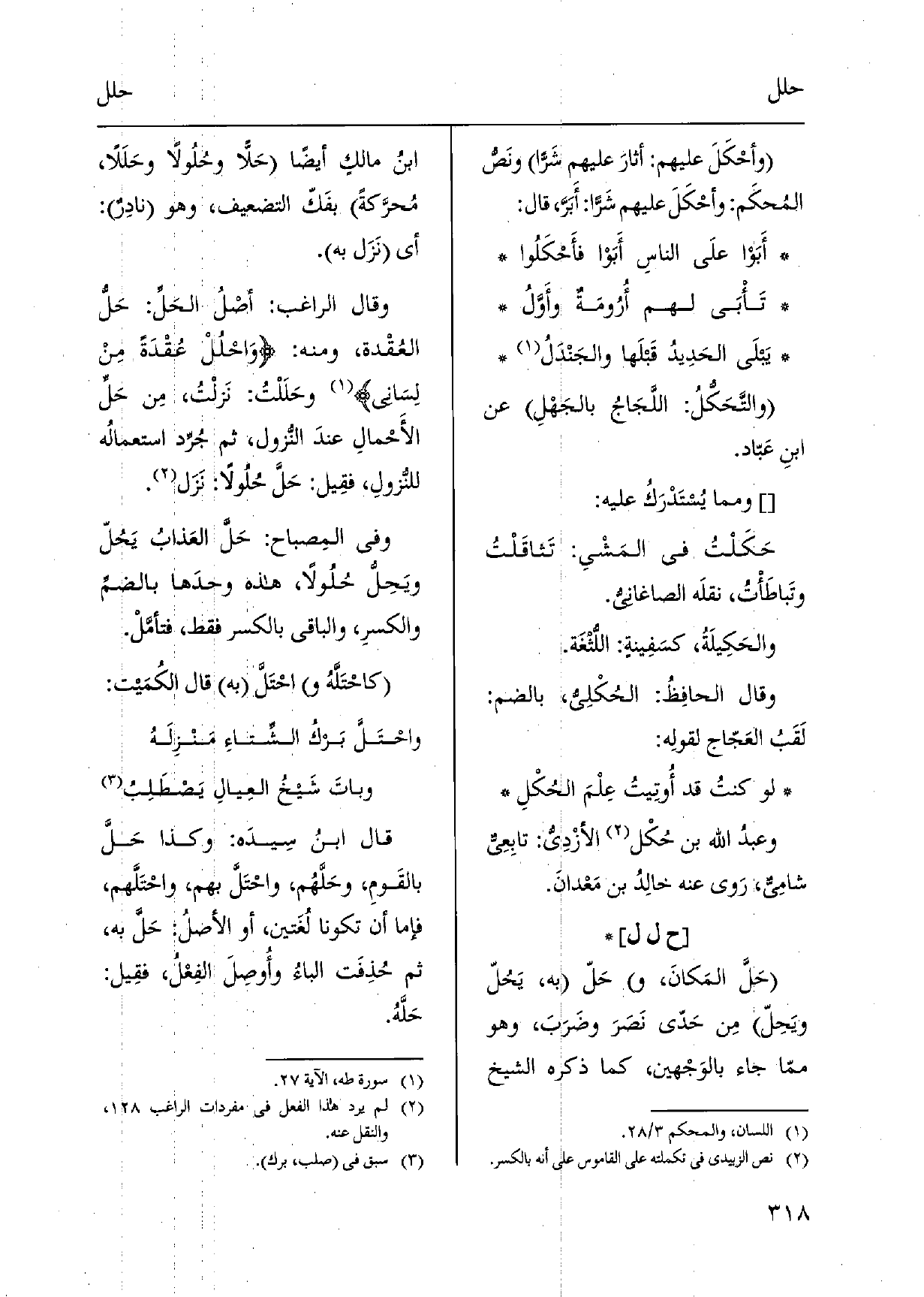 {حَلَّ المَكانَ، حَلّ بِهِ،} يَحُلّ {ويَحِلّ مِن حَدّى نَصَرَ وضَرَبَ، وَهُوَ ممّا جَاءَ بالوَجْهين، كَمَا ذكره الشَّيْخ ابنُ مالكٍ أَيْضا} حَلّاً {وحُلُولاً} وحَلَلاً، مُحرَّكةً بفَكّ التَّضْعِيف، وَهُوَ نادِرٌ: أَي نَزَل بِهِ. وَقَالَ الرَّاغِب: أصْلُ {الحَلِّ: حَلُّ العُقْدة، وَمِنْه:} وَاحْلُلْ عُقْدَةً مِنْ لِسَاني وحَلَلْتُ: نَزلْتُ، مِن حَلِّ الأَحْمالِ عندَ النُّزُول، ثمَّ جُرِّد استعمالُه للنُّزولِ، فقِيل: {حَلَّ} حُلُولاً: نَزَل. وَفِي المِصباح: {حَلَّ العَذابُ يَحُلّ} ويَحِلُّ {حُلُولاً، هَذِه وحدَها بالضمِّ والكسرِ، وَالْبَاقِي بِالْكَسْرِ فَقَط، فتأمَّلْ.} كاحْتَلَّهُ و {احْتَلَّ بِهِ قَالَ الكُمَيت: