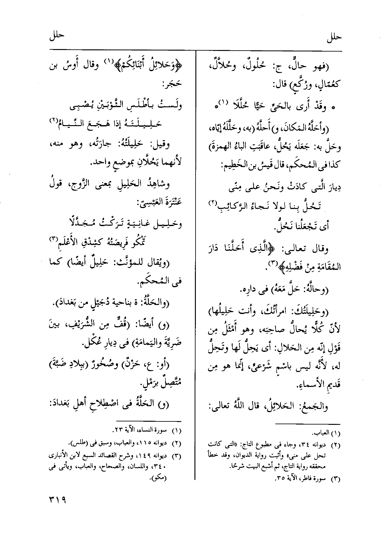 ويُقال للمؤنث: {حَلِيلٌ أَيْضا كَمَا فِي المُحكَم.} والحَلَّةُ: ة بِنَاحِيَة دُجَيلٍ من بَغدادَ. أَيْضا: قُفٌّ مِن الشرَيْفِ، بينَ ضَرِيَّةَ واليَمامَةِ فِي دِيارِ عُكْل. أَو: ع، حَزْنٌ وصُخُورٌ ببِلادِ ضَبَّةَ مُتَّصِلٌ برَمْلٍ.