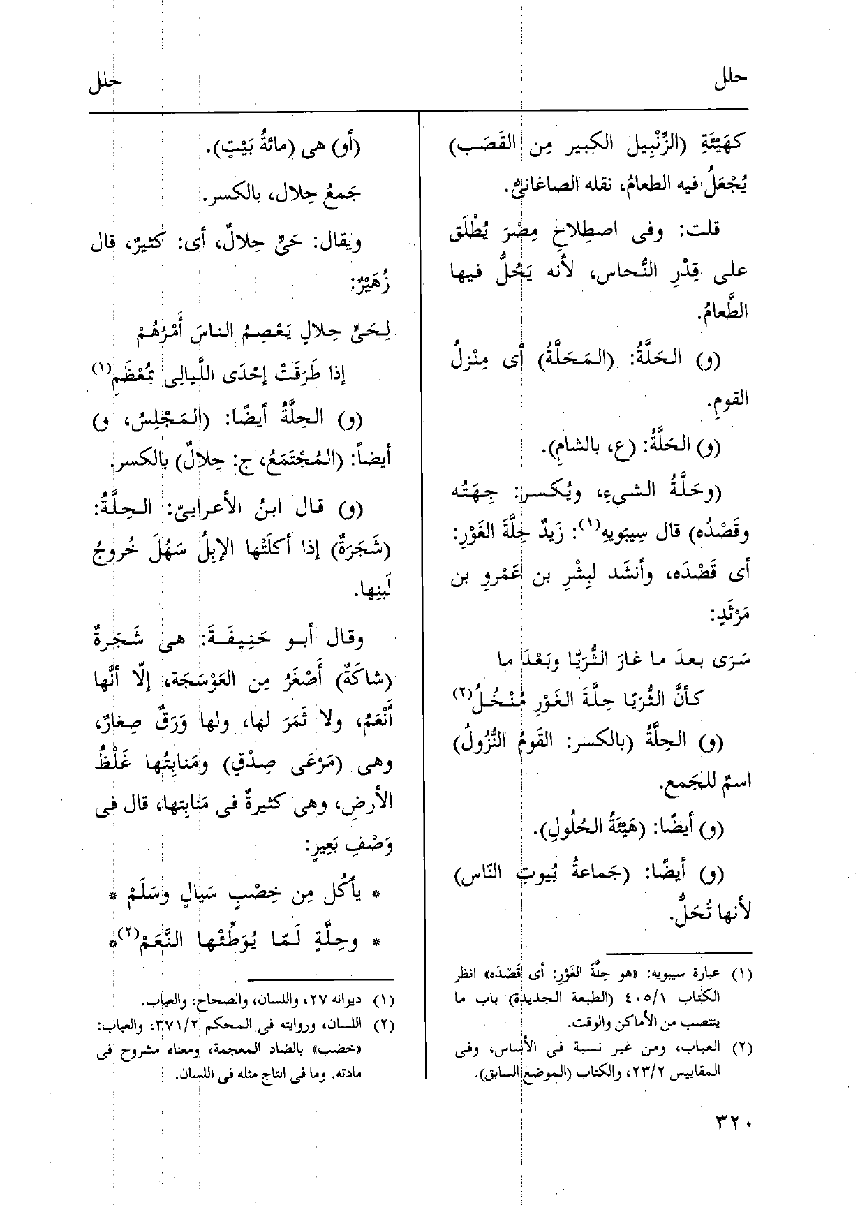 كهَيئَةِ الزِّنْبِيل الْكَبِير مِن القَصَب يُجْعَلُ فِيهِ الطعامُ، نَقله الصَّاغَانِي. قلت: وَفِي اصطِلاح مِصْرَ يُطْلَق على قِدْرِ النُّحاس، لأنَه يَحُلُّ فِيهَا الطَّعامُ. (و) {الحَلَّةُ:} المَحَلَّةُ أَي مِنْزلُ القومِ. (و) {الحَلَّةُ: ع، بالشامِ.} وحَلَّة الشَّيْء، ويُكسر: جِهَتُه وقَصْدُه قَالَ سِيبَويهِ: زَيدٌ حِلَّةَ الغَوْرِ: أَي قَصْدَه، وأنشَد لبِشْرِ بن عَمْروِ بن مَرثَدٍ: