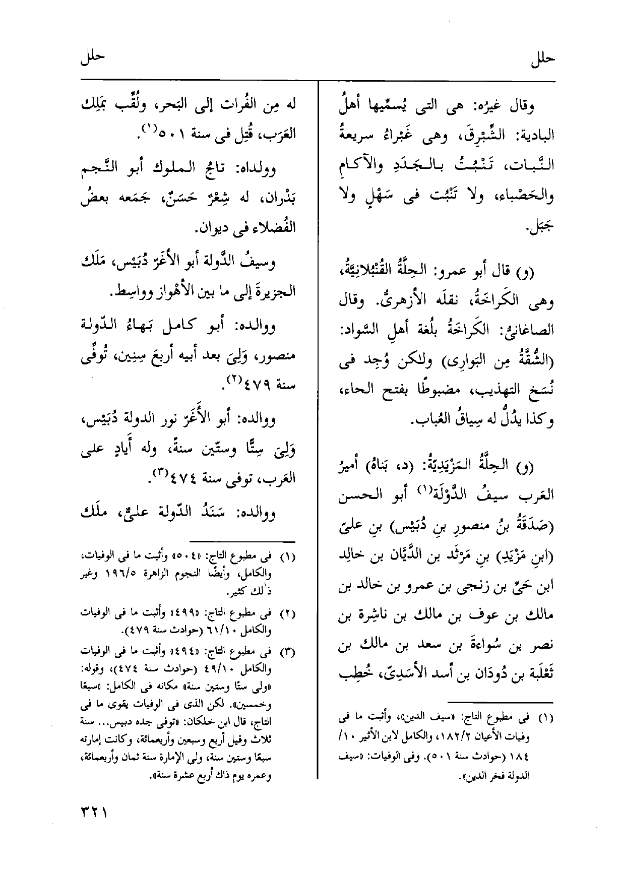 الكَراخَةُ، نقلَه الأزهريُّ. وَقَالَ الصاغانيُّ: الكَراخَةُ بلُغة أهلِ السَّواد: الشّقَّةُ مِن البَوارِي وَلَكِن وُجِد فِي نُسَخ التَّهْذِيب، مضبوطاً بِفَتْح الْحَاء، وَكَذَا يدُلُّ لَهُ سِياقُ العُباب. (و) } الحِلَّةُ المَزْيَدِيّةُ: د، بَناهُ أميرُ العَرب سيفُ الدَّوْلَة أَبُو الْحسن صَدَقَةُ بنُ منصورِ بنِ ذبَيس بنِ عَليّ بنِ مَزْيَدِ بنِ مَرثَد بن الدَّيَّان بن خالِد ابْن حَيِّ بن زنجى بن عَمْرو بن خَالِد بن مَالك بن عَوْف بن مَالك بن ناشِرة بن نصر بن سُواءةَ بن سعد بن مَالك بن ثَعْلَبة بن دُودَان بن أَسد الأسَدِيّ، خُطِب لَهُ مِن الفُرات إِلَى البَحر، ولُقِّب بمَلِك العَرَب، قُتِل فِي سنة. وولداه: تاجُ الْمُلُوك أَبُو النَّجم بَدْران، لَهُ شِعْرٌ حَسَنٌ، جَمَعه بعضُ الفُضلاء فِي ديوَان. وسيفُ الدَّولة أَبُو الأغَرّ دُبَيس، مَلَك الجزيرةَ إِلَى مَا بَين الأهْواز وواسِط. ووالده: أَبُو كَامِل بَهاءُ الدّولة مَنْصُور، وَلِىَ بعد أَبِيه أربعَ سِنِين، توفّي سنة. ووالده: أَبُو الأَغَر نور الدولة دُبَيس، وَلِىَ سِتّاً وستّين سنة، وَله أَيادٍ على العَرب، توفّي سنة. ووالده: سَنَدُ الدّولة عليٌّ، ملَك