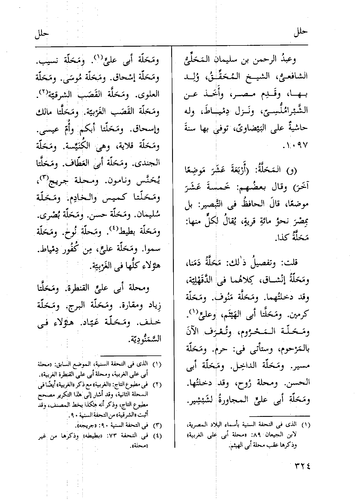 وعبدُ الرَّحْمَن بن سُلَيْمَان المَحَلِّي الشَّافِعِي، الشَّيْخ المُحَقِّقُ، وُلِد بهَا، وقَدِم مصر، وأَخَذ عَن الشَّبرامُلّسِي، ونَزل دِمْياطَ، وَله حاشيةٌ على البَيضاويّ، توفّي بهَا سنةَ. المَحَلَّةُ: أَرْبَعَةَ عَشَرَ مَوضِعاً آخَر وَقَالَ بعضُهم: خَمسةَ عَشَرَ موضعا، قالَ الحافظُ فِي التَّبصير: بل بمِصْرَ نحوُ مائةِ قريةٍ، يُقالُ لكل مِنْهَا: مَحَلَّةُ كَذَا. قلت: وتفصيلُ ذَلِك: {مَحَلَّةُ دَمَنا، ومَحَلّة إنْشاق، كلاهُما فِي الدَّقَهْلِيّة، وَقد دخلتُهما. ومَحَلَّة مَنُوف. ومَحَلّة كرمين. ومَحَلَّتا أبي الهَيثَم، وعليٍّ.