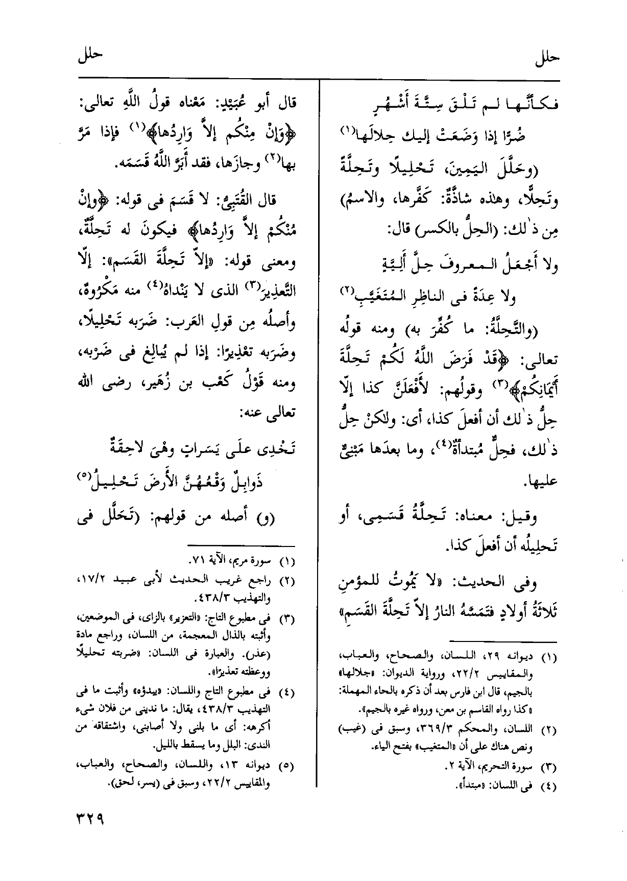 {والتَّحِلَّةُ: مَا كُفِّرَ بِهِ وَمِنْه قولُه تَعَالَى: قَدْ فَرَضَ اللَّهُ لَكُم} تَحِلَّةَ أيمَانِكُم وقولُهم: لأَفْعَلَنَّ كَذَا إلّا {حِلُّ ذَلِك أَن أفعلَ كَذَا، أَي: ولكنْ حِلُّ ذَلِك،} فحِل مُبتدأةٌ، وَمَا بعدَها مَبنيٌّ عَلَيْهَا. وَقيل: مَعْنَاهُ: تَحِلَّةُ قَسَمِى، أَو تَحلِيلُه أَن أفعلَ كَذَا. وَفِي الحَدِيث: لَا يَمُوتُ للمؤمنِ ثَلاثَةُ أولادٍ فتَمَسَّه النارُ إلاّ تَحِلَّةَ القَسَمِ قَالَ أَبُو عُبَيدٍ: مَعْناه قَول اللهِ تَعَالَى: وإنْ مِنْكُم إلاَّ وَارِدُها فَإِذا مَرّ بهَا وجازَها، فقد أَبَرَّ اللَّهُ قَسَمَه. قَالَ القُتَبِيُّ: لَا قَسَمَ فِي قَوْله: وإنْ مُنْكُم إلاَّ وَارِدُها فيكونَ لَهُ تَحَلّةٌ، وَمعنى قَوْله: إلاّ تَحَلّةَ القَسَم: إلّا التَّعذِيرَ الَّذِي لَا يَنْداهُ مِنْهُ مَكْرُوهٌ، وأصلُه مِن قولِ العَرب: ضَرَبه {تَحْلِيلاً، وضَرَبه تعْذِيراً: إِذا لم يُبالِغ فِي ضَربه، وَمِنْه قَولُ كَعْب بن زُهَير، رَضِي الله تَعَالَى عَنهُ: