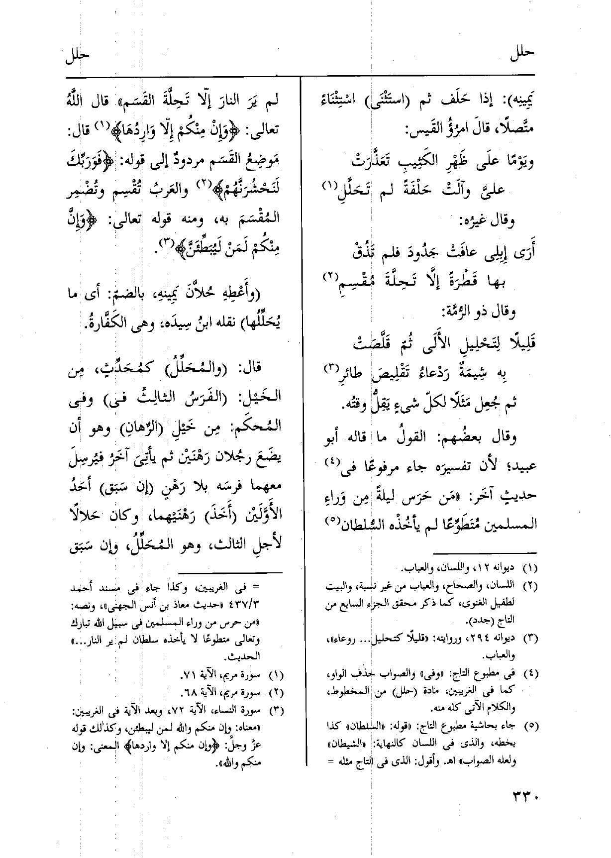 ثمَّ جُعِل مَثَلاً لكلّ شَيْء يَقِلُّ وقتُه. وَقَالَ بعضُهم: القولُ مَا قَالَه أَبُو عبيد، لِأَن تفسيرَه جَاءَ مَرْفُوعا فِي حديثٍ آخَر: مَن حَرَس لَيْلَة مِن وَراءِ الْمُسلمين مُتَطَوعاً لم يأخُذْه السُّلطان لم يَرَ النارَ إلّا تَحِلَّةَ القَسَم قَالَ اللَّهُ تَعَالَى: وَإِنْ مِنْكُم إِلّا وَارِدُهَا قَالَ: مَوضِعُ القَسَم مردودٌ إِلَى قَوْله: فَوَرَبِّكَ لَنَحْشُرَنَّهُم والعَربُ تُقْسِم وتُضْمِر المُقْسَمَ بِهِ، وَمِنْه قَوْله تَعَالَى: وَإنَّ مِنْكُمْ لَمَنْ لَيُبَطِّئَنَّ. وأَعْطِهِ} حُلاَّنَ يَمِينهِ، بالضمّ: أَي مَا يُحَلِّلُها نَقله ابنُ سِيدَه، وَهِي الكَفَّارةُ. قَالَ: {والمُحَلِّلُ كمُحَدِّثٍ، مِن الخَيل: الفَرَسُ الثالِثُ فِي وَفِي المُحكَم: مِن خَيلِ الرِّهانِ وَهُوَ أَن يضَعَ رجُلان رَهْنَيْن ثمَّ يأتِيَ آخَر فيُرسِلَ مَعَهُمَا فرسَه بِلَا رَهْنٍ إِن سَبَق أحَدُ الأَوَّلَيْن أَخَذَ رَهْنَيهما، وَكَانَ} حَلالاً لأجلِ الثَّالِث، وَهُوَ المُحَلِّلُ، وَإِن سَبَق