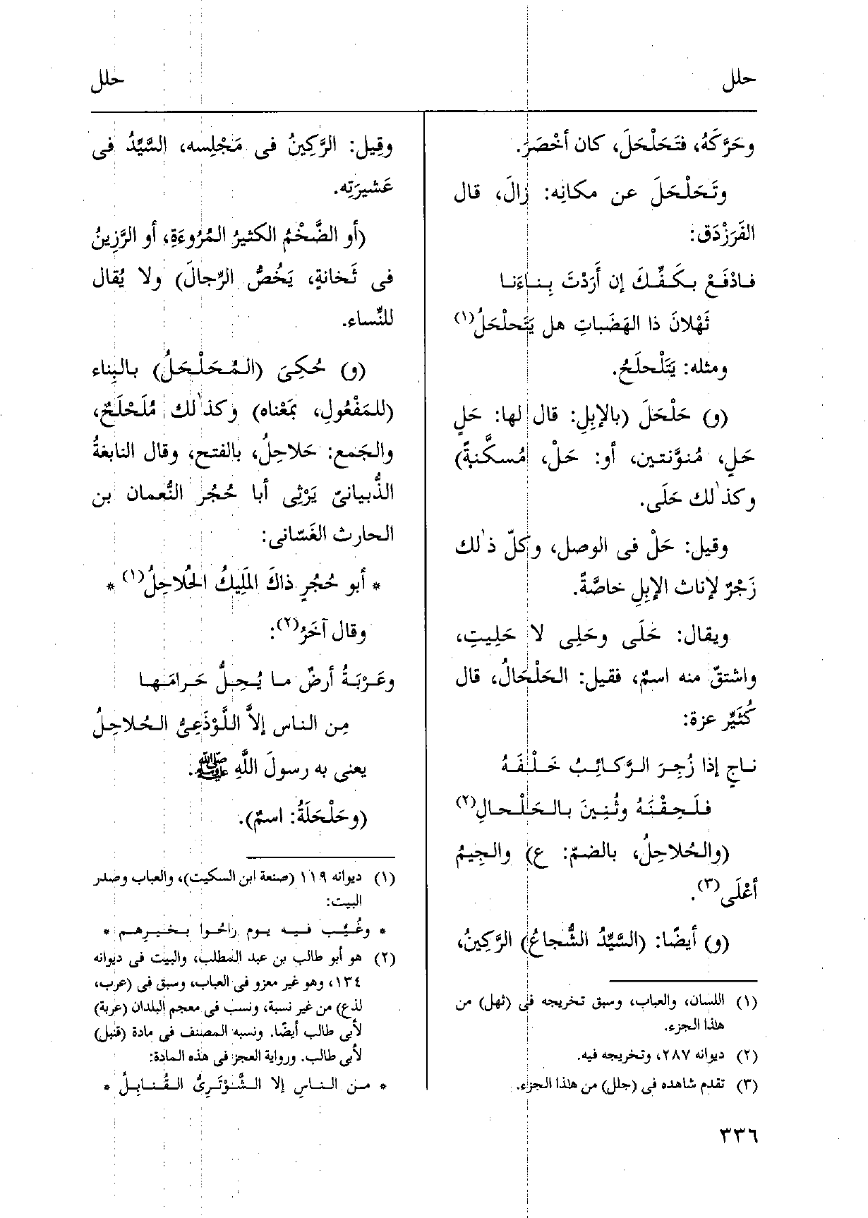{والحُلاحِل، بالضمّ: ع والجِيمُ أعلَى. أَيْضا: السَّيدُ الشجاعُ الرَّكِينُ، وقِيل: الرَّكِينُ فِي مَجْلِسه، السَّيدُ فِي عَشيرَتِه. أَو الضَّخْمُ الكثيرُ المرُوءَةِ، أَو الرَّزِينُ فِي ثَخانةٍ، يَخُصُّ الرِّجالَ وَلَا يُقال للنِّساء. حُكِىَ} المُحَلْحَلُ بالبِناء للمَفْعُولِ، بمَعْناه وَكَذَلِكَ مُلَحْلَحٌ، والجَمع: {حَلاحِلُ، بِالْفَتْح، وَقَالَ النابغةُ الذُّبياني يَرثِي أَبَا حُجُر النُّعمان بن الْحَارِث الغَسّاني: أَبُو حُجُرٍ ذاكَ الملَيكُ} الحُلاحِلُ وَقَالَ آخَر: