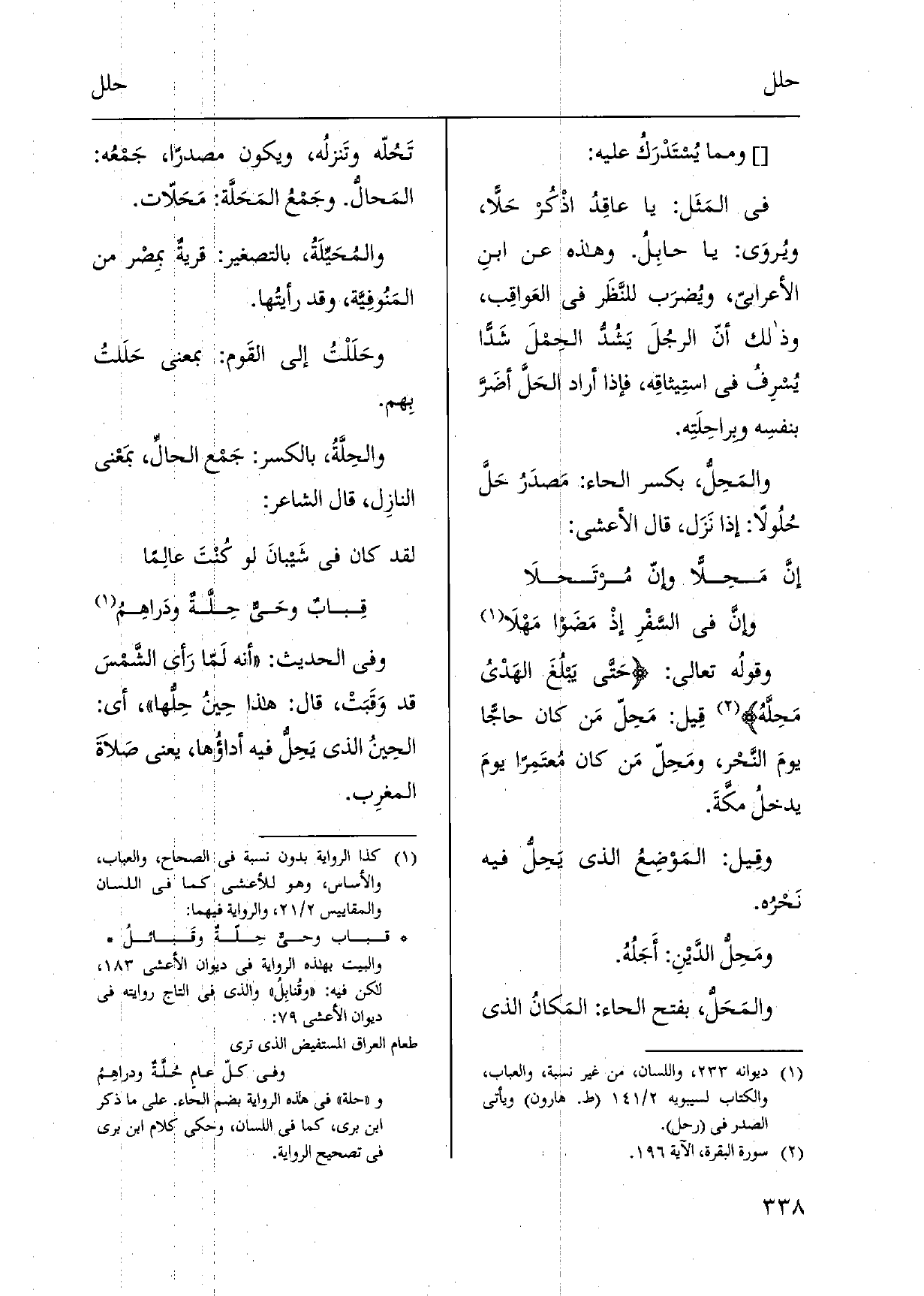 وقولُه تَعَالَى: حَتَّى يَبلُغَ الهَدْى} مَحِلَّهُ قِيل: مَحِلّ مَن كَانَ حاجّاً يومَ النَّحْر، ومَحِلّ مَن كَانَ مُعتَمِراً يومَ يدخلُ مكَّةَ. وقِيل: المَوْضِعُ الَّذِي يَحِلُّ فِيهِ نَحْرُه. {ومَحِل الدَّيْنِ: أَجَلُهُ. والمَحَلُّ، بِفَتْح الْحَاء: المَكانُ الَّذِي} تَحُله وتَنزله، وَيكون مصدرا، جَمْعُه: {المَحالُّ. وجَمْعُ} المَحَلَّة: مَحَلّات.