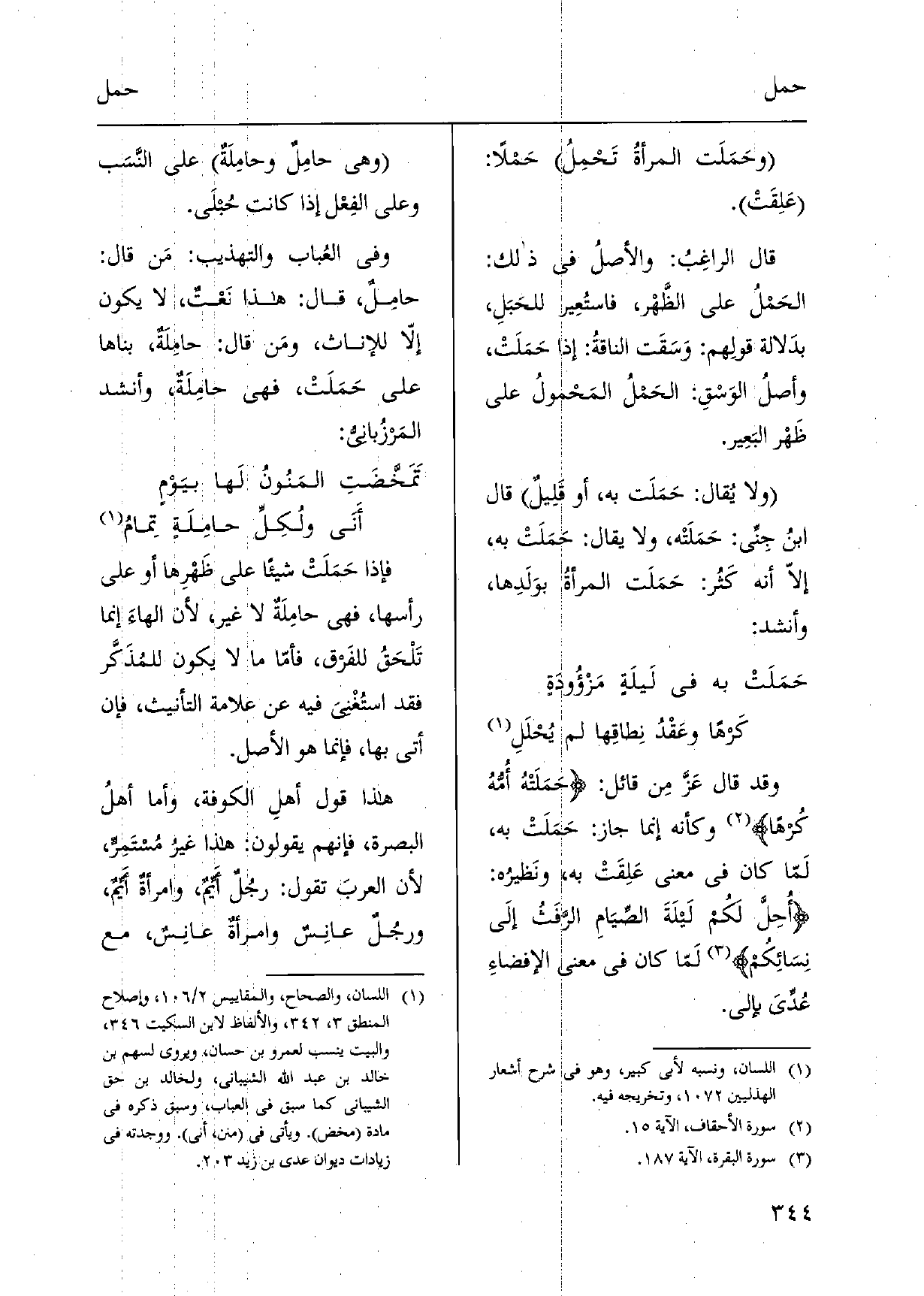 فَإِذا حَمَلَتْ شَيْئا على ظَهْرِها أَو على رَأسهَا، فَهِيَ حامِلَةٌ لَا غير، لِأَن الهاءَ إِنَّمَا تَلْحَقُ للفَرق، فأمّا مَا لَا يكون للمُذَكَّر فقد استُغْنىَ فِيهِ عَن عَلامَة التَّأْنِيث، فَإِن أَتَى بهَا، فَإِنَّمَا هُوَ الأَصْل. هَذَا قَول أهلِ الْكُوفَة، وَأما أهلُ الْبَصْرَة، فَإِنَّهُم يَقُولُونَ: هَذَا غيرُ مُستَمِر، لِأَن العربَ تَقول: رجُلٌ أَيِّمٌ، وَامْرَأَة أَيِّمٌ، ورجُلٌ عانِسٌ وامرأةٌ عانِسٌ، مَعَ
