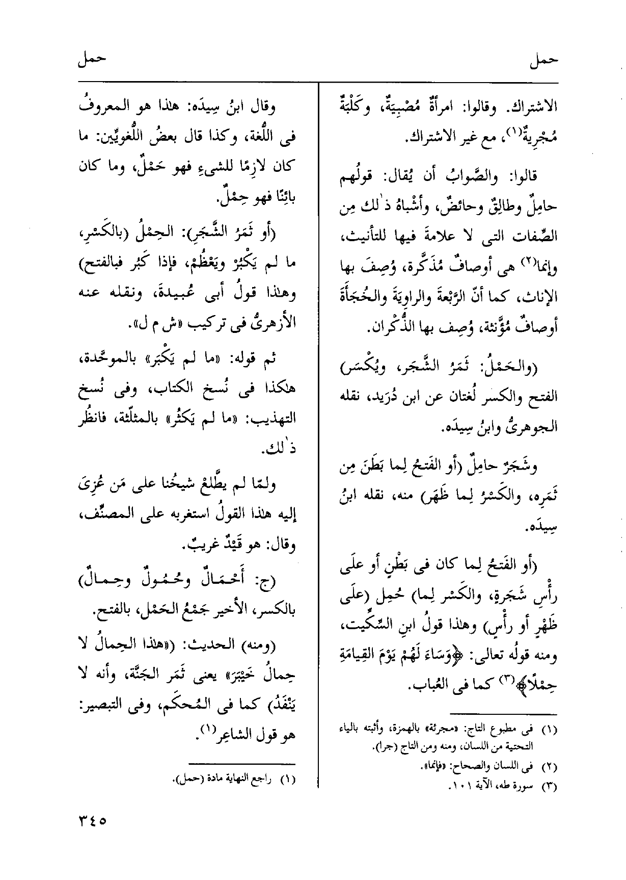الِاشْتِرَاك. وَقَالُوا: امرأةٌ مُصْبِيَةٌ، وكَلْبَةٌ مُجْرِيةٌ، مَعَ غير الِاشْتِرَاك. قَالُوا: والصَّوابُ أَن يُقال: قولُهم حامِلٌ وطالِقٌ وحائضٌ، وأشْباهُ ذَاك مِن الصِّفات الَّتِي لَا علامةَ فِيهَا للتأنيث، وَإِنَّمَا هِيَ أوصافٌ مُذَكَّرة، وُصِفَ بهَا الْإِنَاث، كَمَا أنّ الرَّبْعةَ والراوِيَةَ والخُجَأَةَ أوصافٌ مُؤَّنثة، وُصِف بهَا الذُّكْران. والحَمْلُ: ثَمَرُ الشَّجَر، ويُكْسَر الْفَتْح وَالْكَسْر لُغتان عَن ابْن دُرَيد، نَقله الجوهريّ وابنُ سِيدَه. وشَجَرٌ حامِلٌ أَو الفَتحُ لِما بَطَنَ مِن ثَمَرِه، والكَسرُ لِما ظَهَر مِنْهُ، نَقله ابنُ سِيدَه. أَو الفَتحُ لِما كَانَ فِي بَطْنٍ أَو على رأْسِ شَجَرةٍ، والكَسر لِما حُمِل على ظَهْرٍ أَو رأْسٍ وَهَذَا قولُ ابنِ السِّكِّيت، وَمِنْه قولُه تَعَالَى: وَسَاءَ لَهم يَوْمَ القِيامَةِ حِمْلاً كَمَا فِي العُباب. وَقَالَ ابنُ سِيدَه: هَذَا هُوَ المعروفُ فِي اللُّغَة، وَكَذَا قَالَ بعضُ اللُّغويِّين: مَا كَانَ لازِماً للشَّيْء فَهُوَ حَمْلٌ، وَمَا كَانَ بائِناً فَهُوَ حِمْلٌ. أَو ثَمَرُ الشَّجَرِ: الحِمْلُ بالكَسرِ، مَا لم يَكْبُر ويَعْظُم، فَإِذا كَبُر فبالفتح وَهَذَا قولُ أبي عُبيدةَ، وَنَقله عَنهُ الأزهريُّ فِي تركيب ش م ل. ثمَّ قَوْله: مَا لم يَكْبَر بالموحَّدة، هَكَذَا فِي نُسخ الْكتاب، وَفِي نسخ التَّهْذِيب: مَا لم يَكثُر بالمثلّثة، فانظُر ذَلِك. ولمّا لم يطَّلعْ شَيخنَا على مَن عُزِىَ إِلَيْهِ هَذَا القولُ استغربه على المصنِّف، وَقَالَ: هُوَ قَيدٌ غريبٌ. ج: أَحْمَالٌ وحُمُولٌ وحِمالٌ بِالْكَسْرِ، الْأَخير جَمْعُ الحَمْل، بِالْفَتْح. وَمِنْه الحَدِيث: هَذَا الحِمالُ لَا حِمالُ خَيبَرَ يَعْنِي ثَمَر الجَنَّة، وَأَنه لَا يَنْفَدُ كَمَا فِي المُحكَم، وَفِي التبصير: هُوَ قَول الشاعِر.