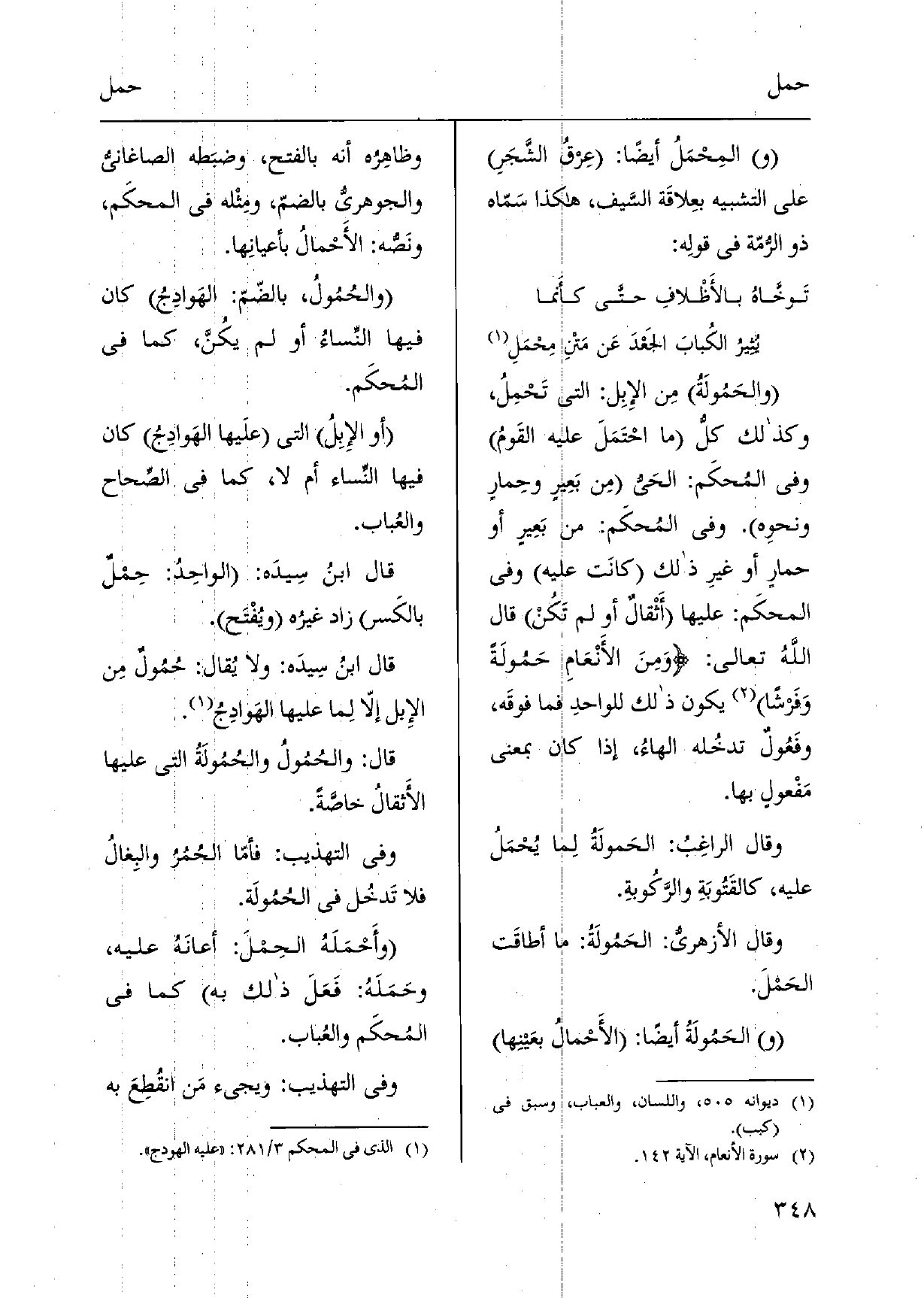 والحَمُولَةُ مِن الإِبِل: الَّتِي تَحْمِلُ، وَكَذَلِكَ كلُّ مَا احْتَمَلَ عَلَيْهِ القَومُ وَفِي المُحكَم: الحَيُّ مِن بَعِيرٍ وحِمارٍ ونحوِه. وَفِي المُحكَم: من بَعِيرٍ أَو حمارٍ أَو غيرِ ذَلِك كانَت عَلَيْهِ وَفِي المحكَم: عَلَيْهَا أَثْقالٌ أَو لم تَكُنْ قَالَ اللَّهُ تَعَالَى: وَمِنَ الأَنْعَامِ حَمُولَةً وَفَرشاً يكون ذَلِك للواحدِ فَمَا فوقَه، وفَعُولٌ تدخُله الهاءُ، إِذا كَانَ بِمَعْنى مَفْعولٍ بهَا. وَقَالَ الراغِبُ: الحَمولَةُ لِما يُحْمَلُ عَلَيْهِ، كالقَتُوبَةِ والرَّكُوبةِ. وَقَالَ الأزهريُّ: الحَمُولَةُ: مَا أطاقَت الحَمْلَ. الحَمُولَة أَيْضا: الأَحْمالُ بعَينِها وظاهِره أَنه بِالْفَتْح، وضبَطه الصاغانيُّ والجوهريّ بالضمّ، ومِثْله فِي المحكَم، ونَصُّه: الأَحْمالُ بأعيانِها. والحُمُولُ، بالضّمّ: الهَوادِجُ كَانَ فِيهَا النِّساءُ أَو لم يكُنَّ، كَمَا فِي المُحكَم. أَو الإِبِلُ الَّتِي علَيها الهَوادِجُ كَانَ فِيهَا النِّساء أم لَا، كَمَا فِي الصِّحاح والعُباب. قَالَ ابنُ سِيدَه: الواحِدُ: حِمْلٌ بالكَسر زَاد غيرُه ويُفْتَح. قَالَ ابنُ سِيدَه: وَلَا يُقال: حُمُولٌ مِن الإِبل إلّا لِما عَلَيْهَا الهَوادِجُ. قَالَ: والحُمُولُ والحُمُولَةُ الَّتِي عَلَيْهَا الأَثقالُ خاصَّةً. وَفِي التَّهْذِيب: فأمّا الحُمُرُ والبِغالُ فَلَا تَدخُل فِي الحُمُولَة. وأَحْمَلَهُ الحِمْلَ: أعانَهُ عَلَيْهِ، وحَمَلَهُ: فَعَلَ ذَلِك بِهِ كَمَا فِي المُحكَم والعُباب. وَفِي التَّهْذِيب: وَيَجِيء مَن انقُطِعَ بِهِ