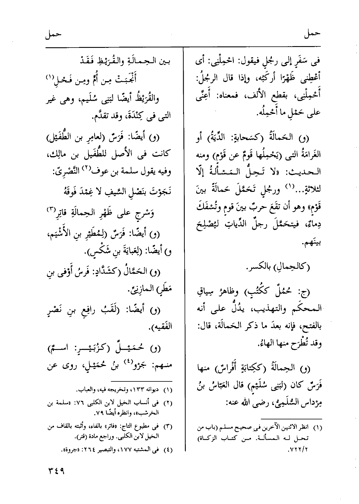 فِي سَفَرٍ أبي رجُلٍ فَيَقُول: احْمِلْني: أَي أعْطِني ظَهْراً أركَبُه، وَإِذا قَالَ الرجُلُ: أَحْمِلْني، بِقطع الْألف، فَمَعْنَاه: أَعِنِّي على حَمْلِ مَا أَحْمِلُه. الحَمالَةُ كسَحابةٍ: الدِّيَةُ أَو الغَرامَةُ الَّتِي يَحْمِلُها قَومٌ عَن قَوْمٍ وَمِنْه الحَدِيث: لَا تَحِل المَسألةُ إلّا لثلاثةٍ ... ورجُلٍ تَحَمَّلَ حَمالَةً بينَ قَوْمٍ وَهُوَ أَن تقَعَ حربٌ بينَ قومٍ وتُسْفَكَ دِماءٌ، فيتحَمَّلَ رجل الدِّياتِ ليُصْلِحَ بينَهم. كالحِمالِ بِالْكَسْرِ. ج: حُمُلٌ ككُتُبٍ وظاهرُ سِياقِ المحكَم والتهذيب، يدُلُّ على أَنه بِالْفَتْح، فَإِنَّهُ بعدَ مَا ذكر الحَمالَة، قَالَ: وَقد تُطْرَح مِنْهَا الهاءُ. الحِمالَةُ ككِتابَةٍ أَفْراسٌ مِنْهَا فَرَسٌ كَانَ لبَني سُلَيمٍ قَالَ العَبّاسُ بنُ مِرداس السُّلَمِيُّ، رَضِي الله عَنهُ: بَين الحِمالَةِ والقُرَيْظِ فَقَدْ أَنْجَبَتْ مِن أُمًّ ومِن فَحْلِ والقُرَيْظُ أَيْضا لبَني سُلَيم، وَهِي غير الَّتِي فِي كِنْدَةَ، وَقد تقدَّم. أَيْضا: فَرَسٌ العامِرِ)
