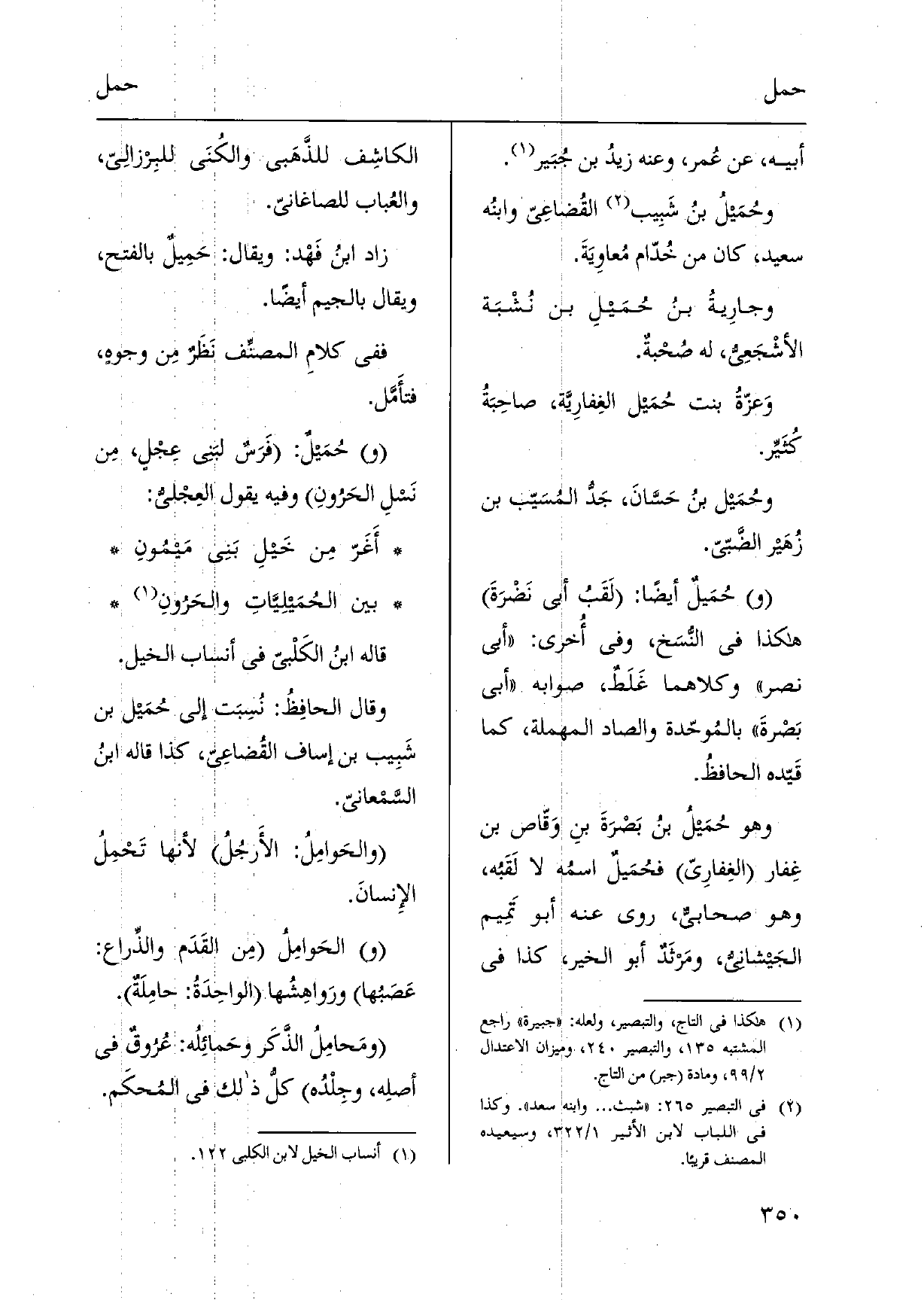 أَبِيه، عَن عُمر، وَعنهُ زيدُ بن جُبَير. وحمَيلُ بنُ شَبِيب القُضاعِيّ وَابْنه سعيد، كَانَ من خدّام مُعاوِيَةَ. وجارِيةُ بنُ حُمَيلِ بن نُشْبَة الأشْجَعِيُّ، لَهُ صُحْبةٌ. وَعزّةُ بنت حُمَيل الغِفارِيَّة، صاحِبَةُ كثَيِّر. وخمَيل بنُ حَسَّانَ، جَدُّ المُسَيّب بن زُهَير الضَّبّيّ. حُمَيلٌ أَيْضا: لَقَبُ أبي نَضْرَةَ هَكَذَا فِي النُّسَخ، وَفِي أُخرى: أبي نصر وَكِلَاهُمَا غَلَطٌ، صَوَابه أبي بَصْرةَ بالمُوحّدة وَالصَّاد الْمُهْملَة، كَمَا قَيّده الحافظُ. وَهُوَ حُمَيل بنُ بَصْرَةَ بنِ وَقّاص بن غِفار الغِفارِيّ فحُمَيلٌ اسمُه لَا لَقَبُه، وَهُوَ صحابيٌ، روى عَنهُ أَبُو تَمِيم الجَيشانيُّ، ومَرثَدٌ أَبُو الْخَيْر، كَذَا فِي الكاشِف للذَّهَبى والكُنَى للبِرزالِيّ، والعُباب للصاغاني. زَاد ابنُ فَهْد: وَيُقَال: حَمِيلٌ بِالْفَتْح، وَيُقَال بِالْجِيم أَيْضا. فَفِي كلامِ المصنِّف نَظَرٌ مِن وجوهٍ، فتأَمَّل. حُمَيل: فَرَسٌ لبَني عِجْلٍ، مِن نَسلِ الحَرُونِ وَفِيه يَقُول العِجْليُّ: أَغَرّ مِن خَيلِ بَنِى مَيمُونِ بَين الحُمَيلِيَّاتِ والحَرُونِ قَالَه ابنُ الكَلْبيّ فِي أَنْسَاب الْخَيل.