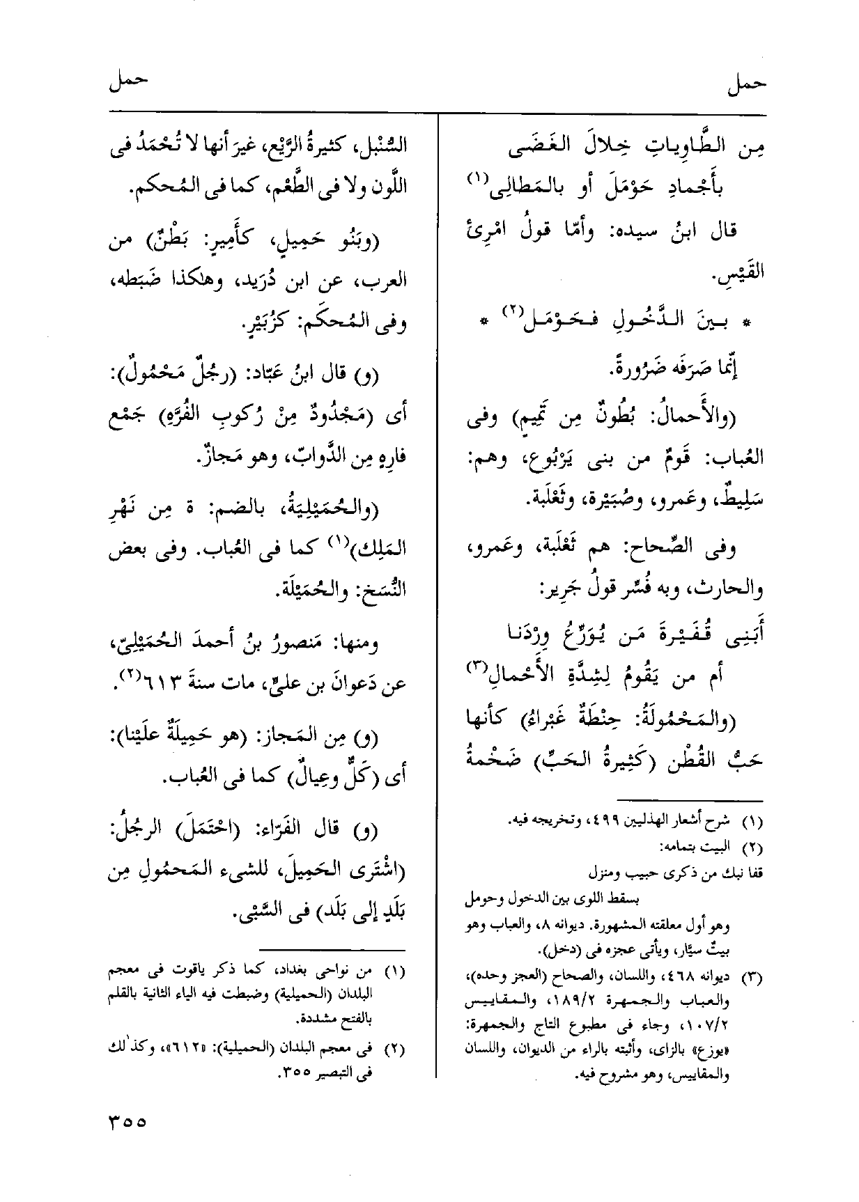 والمَحْمُولَةُ: حِنْطَةٌ غَبراءُ كَأَنَّهَا حَبُّ القُطْن كَثِيرةُ الحَبِّ ضَخْمةُ السُّنْبل، كثيرةُ الرَّيْع، غيرَ أَنَّهَا لَا تُحْمَد فِي اللَّون وَلَا فِي الطَّعْم، كَمَا فِي المُحكم. وبَنُو حَمِيلٍ، كأَمِيرٍ: بَطْنٌ من الْعَرَب، عَن ابْن دُرَيد، وَهَكَذَا ضَبَطه، وَفِي المُحكَم: كزُبَيرٍ. قَالَ ابنُ عَبّاد: رجُلٌ مَحْمُولٌ: أَي مَجْدُودٌ مِنْ رُكوبِ الفرَّهِ جَمع فارِهٍ مِن الدَّوابّ، وَهُوَ مَجاز. والحُمَيلِيَةُ، بِالضَّمِّ: ة مِن نَهْرِ المَلِك كَمَا فِي العُباب. وَفِي بعض النُّسَخ: والحُمَيلَة. وَمِنْهَا: مَنصورُ بنُ أحمدَ الحُمَيلِي، عَن دَعوانَ بن عليٍّ، مَاتَ سنةَ. مِن المَجاز: هُوَ حَمِيلَةٌ علَينا: أَي كَلٌّ وعِيالٌ كَمَا فِي العُباب. قَالَ الفَرّاء: احْتَمَلَ الرجُلُ: اشْتَرى الحَمِيلَ، للشَّيْء المَحمُولِ مِن بَلَدٍ إِلَى بَلَد فِي السَّبي.