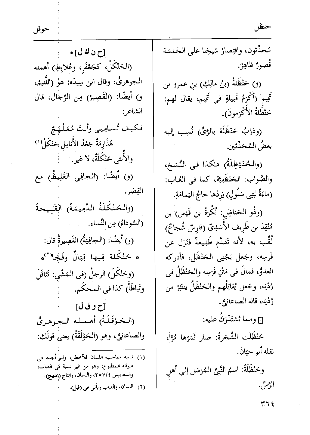 مُحدِّثون، واقتِصارُ شيخِنا على الخَمْسَة قُصورٌ ظاهِرٌ. حَنْظَلةُ بنُ مالكِ بنِ عَمْرو بن تَمِيمٍ أَكْرَمُ قَبيلةٍ فِي تَمِيم، يُقَال لَهُم: حَنْظَلةُ الأَكْرَمونَ. ودَرْبُ حَنْظَلَة بالرَّيِّ نُسِب إِلَيْهِ بعضُ المُحَدِّثين. والحُنَيظِلَةُ هَكَذَا فِي النُّسَخ، والصَّواب: الحَنْظَلِيَّة، كَمَا فِي العُباب: ماءَةٌ لبَني سَلُولٍ يَرِدُها حاجُّ اليَمامَةِ. وذُو الحَناظِلِ: نُكْرَةُ بن قَيس بن مُنْقِذ بن طَرِيف الأَسَدِيّ فارِسٌ شُجاعٌ لُقِّب بِهِ، لِأَنَّهُ تَقدَّم طَلِيعةً فنَزَل عَن فَرسِه، وجَعل يَجْنِي الحَنْظَل، فأدركه الْعَدو، فمالَ فِي مَتن فَرَسِه والحَنْظَلُ فِي رُدْنِه، وجَعل يُقاتِلُهم والحَنْظَلُ ينتَثِرُ من رُدْنِه، قَالَه الصاغانيُّ.