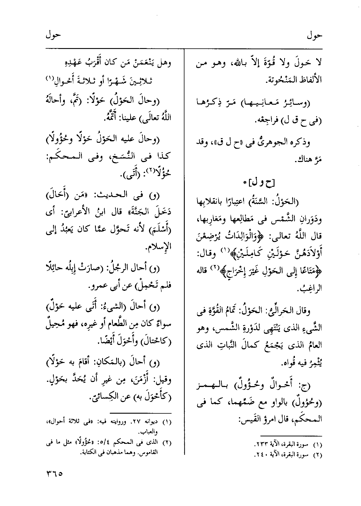 {الحَوْلُ: السَّنَةُ اعتِباراً بانقلابِها ودَوَرانِ الشَّمس فِي مَطالِعها ومَغارِبها، قَالَ اللَّه تَعَالَى: وَالْوَالِدَاتُ يُرضِعْنَ أَوْلاَدَهنَّ} حَوْلَيْنِ كَامِلَيْنِ وَقَالَ: مَتَاعاً إِلَى الحَولِ غَيرَ إِخْرَاجٍ قَالَه الراغِبُ. وَقَالَ الحَرالِّيُّ: الحَوْلُ: تَمامُ القُوَّةِ فِي الشَّيْء الَّذِي يَنْتَهي لدَوْرةِ الشَّمس، وَهُوَ العامُ الَّذِي يَجْمَعُ كمالَ النَّباتِ الَّذِي يُثْمِرُ فِيهِ قواه. ج: {أَحْوالٌ} وحُؤُولٌ بِالْهَمْز {وحُوُولٌ بِالْوَاو مَعَ ضَمِّهما، كَمَا فِي المحكَم، قَالَ امْرُؤ القَيس: