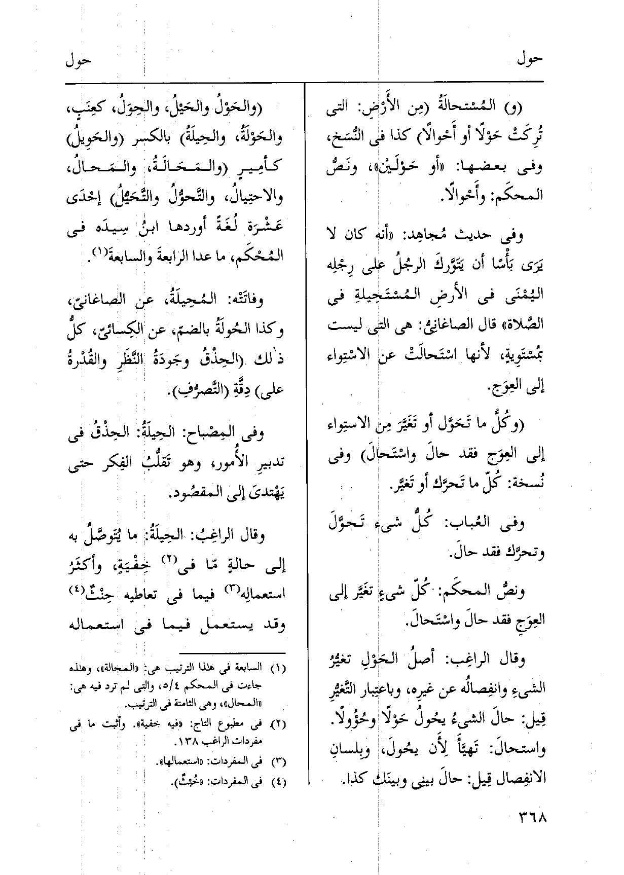 (و) {المُسْتحالَةُ مِن الأرْضِ: الَّتِي تُرِكَتْ} حَوْلاً أَو {أَحْوالاً كَذَا فِي النسَخ، وَفِي بَعْضهَا: أَو} حَوْلَيْن، ونَصُّ المحكَم: {وأَحْوالاً. وَفِي حَدِيث مُجاهِد: أَنه كَانَ لَا يَرَى بَأْساً أَن يَتَوَّركَ الرجُلُ على رِجْلِه اليُمْنَى فِي الأرضِ} المُسْتَحِيلةِ فِي الصَّلاة قَالَ الصاغانيُّ: هِيَ الَّتِي لَيست بمُسْتَوِيةٍ، لِأَنَّهَا {اسْتَحالَتْ عَن الاستِواء إِلَى العِوَج. وكُلُّ مَا} تَحَوَّل أَو تَغَيَّرَ مِن الاستِواء إِلَى العِوَج فقد {حالَ} واسْتَحالَ وَفِي نُسخة: كُلّ مَا تَحرَّك أَو تَغيَّر. وَفِي العُباب: كُلُّ شَيْء {تَحوَّلَ وتحرَّك فقد حالَ. ونصُّ المحكَم: كلّ شَيْء تغَيَّر إِلَى العِوَجِ فقد} حالَ {واسْتَحالَ. وَقَالَ الراغِب: أصلُ} الحَوْلِ تغيُّرُ الشَّيْء وانفِصالُه عَن غيرِه، وباعتِبار التَّغيُّرِ قِيل: {حالَ الشَّيْء} يحُولُ {حَوْلاً} وحُؤُولاً. {واستحالَ: تَهيَّأَ لأَن} يحُولَ، وبلسانِ الانفِصال قِيل: {حالَ بيني وبينَك كَذَا.} والحَوْلُ والحَيلُ، {والحِوَلٌ، كعِنَبٍ،} والحَوْلَةُ، {والحِيلَةُ بِالْكَسْرِ} والحَوِيل كأمِيرٍ {والمَحَالَة،} والمَحالُ، {والاحتِيالُ،} والتَّحوّلُ والتَّحَيُّلُ إحْدَى عَشْرَة لُغَةً أوردهَا ابنُ سِيدَه فِي المُحْكَم، مَا عدا الرابعةَ والسابعةَ. وفاتَتْه: {المُحِيلَةُ، عَن الصَّاغَانِي، وَكَذَا} الحُولَةُ بالضمّ، عَن الْكسَائي، كلُّ ذَلِك الحِذْقُ وجَودَةُ النَّظَرِ والقُدْرةُ على دِقَّةِ التَّصرُّفِ. وَفِي المِصْباح:! الحِيلَةُ: الحِذْقُ فِي تدبيير الأُمور، وَهُوَ تَقلُّبُ الفِكر حَتَّى يَهْتديَ إِلَى المقصُود. وَقَالَ الراغِبُ: الحِيلَةُ: مَا يُتَوصَّلُ بِهِ إِلَى حالةٍ مّا فِي خِفْيَةٍ، وأكثَرُ استعمالِه فِيمَا فِي تعاطيه حِنْثٌ قد يسْتَعْمل فِيمَا فِي اسْتِعْمَاله