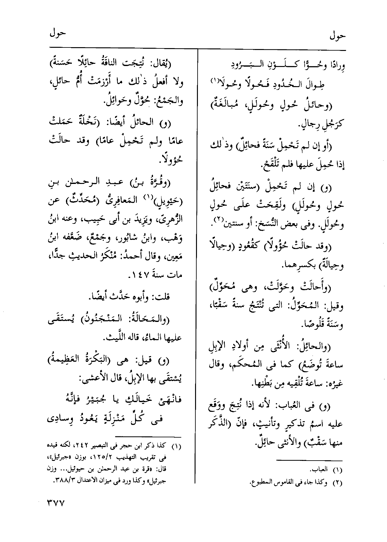 } وحائلُ {حُولٍ} وحُولَلٍ، مُبالَغَةٌ كرَجُلِ رِجالٍ. أَو إِن لم تَحْمِلْ سَنَةً {فحائِلٌ وَذَلِكَ إِذا حُمِلَ عَلَيْهَا فَلم تَلْقَحْ. إِن لم تَحْمِلْ سنَتَيْن فحائِلُ} حُولٍ {وحُولَلٍ ولَقِحَتْ على حُولٍ} وحُولَلٍ. وَفِي بعض النُّسَخ: أَو سنتَيْن. وَقد {حالَتْ} حُؤُولاً كقُعُودٍ {وحِيالاً} وحِيالَةً بكسرِهما. {وأَحالَتْ} وحَوَّلَتْ، وَهِي {مُحَوِّلٌ وَقيل:} المُحَوِّلُ: الَّتِي تُنْتَجُ سنة سَقْباً، وسَنَةً قَلُوصاً. {والحائِلُ: الأُنْثَى مِن أولادِ الإبِلِ ساعةَ تُوضَعُ كَمَا فِي المُحكَم، وَقَالَ غيرُه: ساعةَ تُلْقِيه مِن بَطْنِها. فِي العُباب: لِأَنَّهُ إِذا نُتِجَ ووَقَع عَلَيْهِ اسمُ تذكيرٍ وتأنيثٍ، فإنّ الذَّكَر مِنْهَا سَقْبٌ وَالْأُنْثَى حائِلٌ. يُقال: نُتِجَت الناقَةُ} حائِلاً حَسَنةً وَلَا أفعلُ ذَلِك مَا أَرْزمَتْ أمُّ حائلٍ، والجَمْعُ: {حُوَّلٌ} وحَوائِلُ. (و) {الحائلُ أَيْضا: نَخْلَةٌ حَمَلتْ عَاما وَلم تَحْمِلْ عَاما وَقد حالَتْ} حُؤولاً. وقُرَّةُ بنُ عبدِ الرَّحْمَن بنِ {حَيْوِيلٍ المَعافِرِيُّ مُحَدِّثٌ عَن الزُّهرِيّ، ويَزِيدَ بن أبي حَبِيب، وَعنهُ ابنُ وَهْب، وابنُ شابُور، وجَمْعٌ، ضَعَّفه ابنُ مَعِين، وَقَالَ أحمدُ: مُنْكَرُ الحديثِ جدّاً، مَاتَ سنةَ. قلت: وَأَبوهُ حَدَّث أَيْضا.} والمَحَالَةُ: المَنْجَنُونُ يُستَقَى عَلَيْهَا الماءُ، قَالَه اللَّيث. قيل: هِيَ البَكْرَةُ العَظِيمةُ يُستقَى بهَا الإبِلُ، قَالَ الْأَعْشَى: