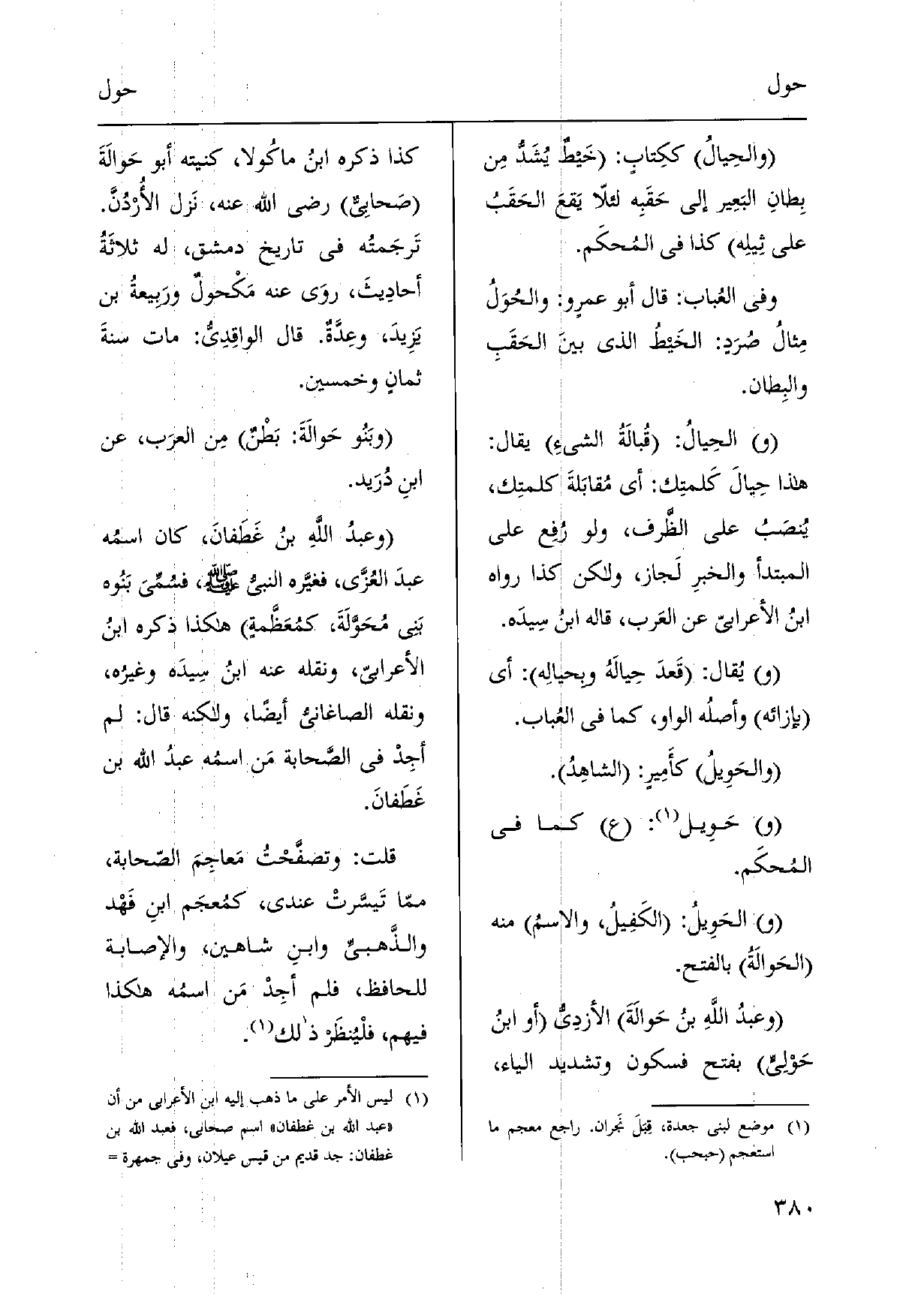 وعبدُ اللَّهِ بنُ غَطَفانَ، كَانَ اسمُه عبدَ العُزَّى، فغيَّره النَّبِي صلى الله عَلَيْهِ وَسلم، فسُمِّيَ بَنُوه بَني} مُحَوَّلَةَ، كمُعَظَّمةٍ هَكَذَا ذكره ابنُ الأعرابيّ، وَنَقله عَنهُ ابنُ سِيدَه وغيرُه، وَنَقله الصاغانيُ أَيْضا، وَلكنه قَالَ: لم أجِدْ فِي الصَّحابة مَن اسمُه عبدُ الله بن غَطَفانَ. قلت: وتصفَّحْتُ مَعاجِمَ الصّحابة، ممّا تَيسَّرتْ عِنْدِي، كمُعجَم ابنِ فَهْد والذَّهبي وابنِ شاهين، والإصابة لِلْحَافِظِ، فَلم أجِدْ مَن اسمُه هَكَذَا فيهم، فلْيُنظَر ذَلِك.