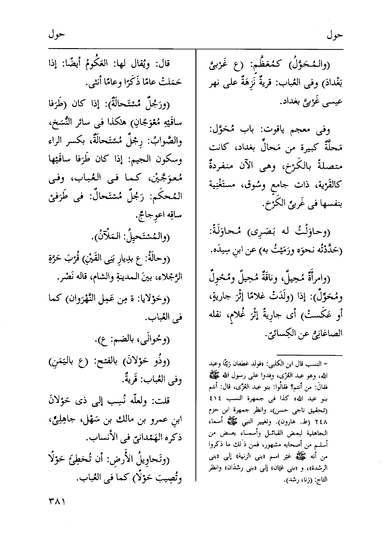ورَجُلٌ {مُستَحالَةٌ: إِذا كَانَ طَرَفا ساقَيهِ مُعْوَجّانِ هَكَذَا فِي سَائِر النُّسَخ، والصَّوابُ: رِجْلٌ مُستَحالَةٌ، بِكَسْر الرَّاء وَسُكُون الْجِيم: إِذا كَانَ طَرَفا ساقَيها مُعوَجَّيْن، كَمَا فِي العُباب، وَفِي المُحكَم: رَجُلٌ} مُستَحالٌ: فِي طَرَفي ساقِه اعوِجاجٌ. {والمُستَحيِلُ: المَلْآن. وحالَةُ: ع بدِيارِ بَني القَيْنِ قُربَ حَرَّةِ الرَّجْلاء، بينَ المدينةِ وَالشَّام، قَالَه نَصْر.} وحَوْلايا: ة مِن عَمِل النَّهْرَوان كَمَا فِي العُباب. {وحُوالى، بِالضَّمِّ: ع. وذُو} حَوْلانَ بِالْفَتْح: ع باليَمَنِ وَفِي العُباب: قَريةٌ. قلت: ولعلّه نُسِب إِلَى ذِي حَولانَ ابنِ عَمْرو بن مَالك بن سَهْل، جاهِلِيٍّ، ذكره الهَمْداني فِي الْأَنْسَاب.