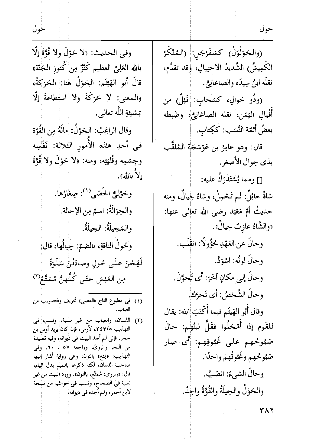 والحَوْلُ والحِيلَةُ والقُوَّةُ واحِدٌ. وَفِي الحَدِيث: لَا حَولَ وَلَا قُوَّةَ إلّا بِاللَّه العَلِي الْعَظِيم كَنْزٌ مِن كُنوزِ الجَنّة قالَ أَبُو الهَيثم: الحَوْلُ هُنَا: الحَرَكةُ، وَالْمعْنَى: لَا حَرَكَةَ وَلَا استطاعةَ إلّا بمشيئةِ اللَّه تَعَالَى. وَقَالَ الراغِبُ: الحَوْلُ: مالَهُ مِن القُوّة فِي أحدِ هَذِه الأُمورِ الثَّلَاثَة: نَفْسِه وجِسمِه وقُنْيتِه، وَمِنْه: لَا حَوْلَ وَلَا قُوَّةَ إلاَّ بِاللَّه. {- وحَوْلِيُّ الحَصَى: صِغارُها.} والحِوَالَةُ: اسمٌ مِن {الإحالة.} والمَحِيلَةُ: {الحِيلَةُ.} وحُولُ الناقةِ، بالضمّ: {حِيالُها، قَالَ: