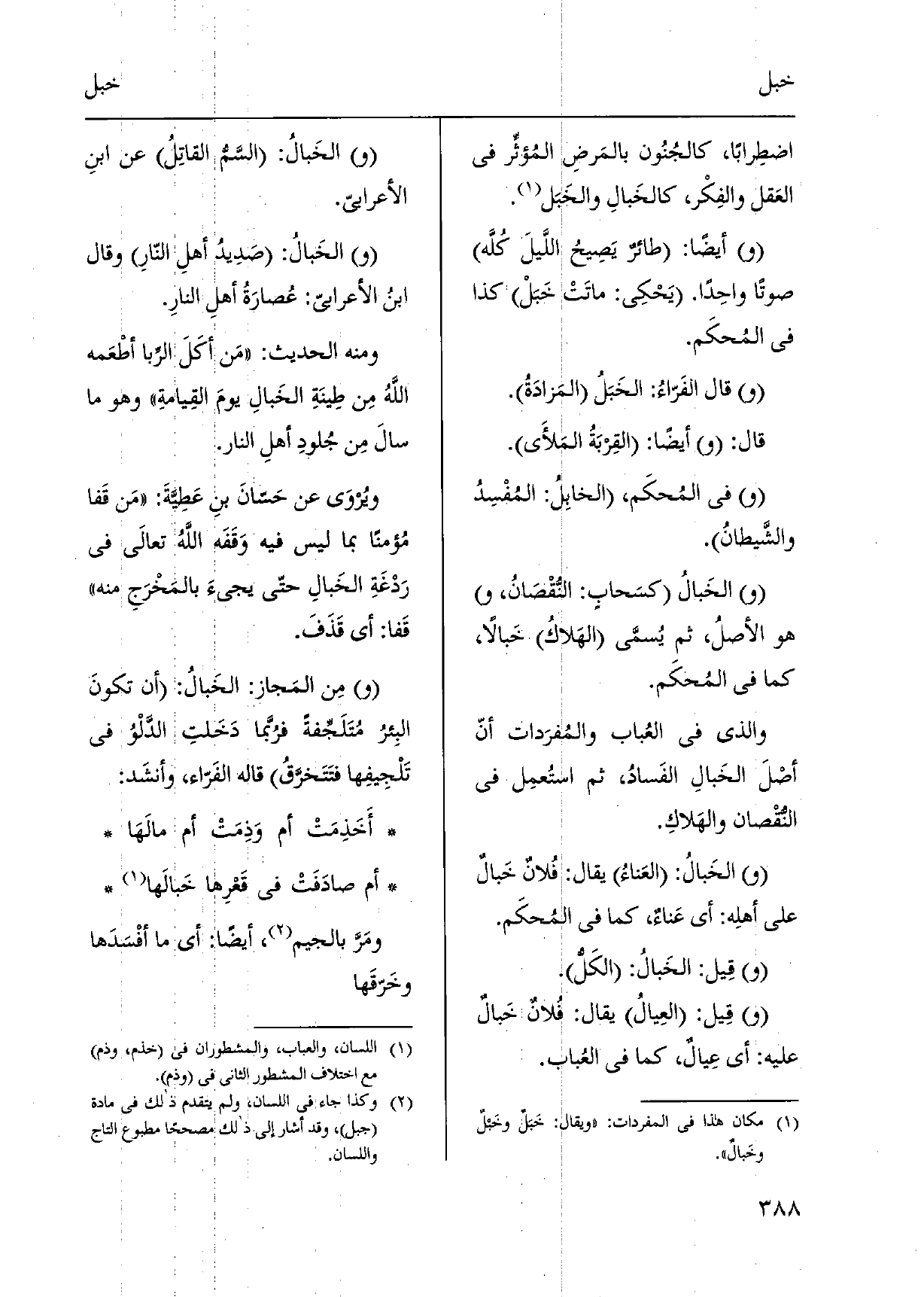 اللَّيلَ كُلَّه صَوتا واحِداً. يَحْكِي: ماتَتْ خَبَلْ كَذَا فِي المُحكَم. قَالَ الفَرّاءُ: الخَبَلُ المَزادَةُ. قَالَ: أَيْضا: القِربَةُ المَلأَى. فِي المُحكَم، الخابِلُ: المُفْسِدُ والشَّيطانُ. الخَبالُ كسَحابٍ: النُّقْصَانُ، هُوَ الأصلُ، ثمَّ يُسمَّى الهَلاكُ خَبالاً، كَمَا فِي المُحكَم. وَالَّذِي فِي العُباب والمُفرَدات أنّ أصْلَ الخَبالِ الفَسادُ، ثمَّ استُعمِل فِي النُّقْصان والهَلاكِ. الخَبالُ: العَناءُ يُقَال: فُلانٌ خَبالٌ على أهلِه: أَي عَناءٌ، كَمَا فِي المُحكَم. قِيل: الخَبالُ: الكَلُّ. قِيل: العِيالُ يُقَال: فُلانٌ خَبالٌ عَلَيْهِ: أَي عِيالٌ، كَمَا فِي العُباب. الخَبالُ: السَّمُّ القاتِلُ عَن ابنِ الأعرابيّ. الخَبالُ: صَدِيدُ أهلِ النّارِ وَقَالَ ابنُ الْأَعرَابِي: عُصارَةُ أهلِ النارِ. وَمِنْه الحَدِيث: مَن أكَلَ الرِّبَا أطْعَمه اللَّهُ مِن طِينَةِ الخَبالِ يومَ القِيامةِ وَهُوَ مَا سالَ مِن جُلودِ أهلِ النَّار. ويُروَى عَن حَسّانَ بنِ عَطَيّةَ: مَن قَفا مُؤمناً بِمَا لَيْسَ فِيهِ وَقَفَه اللَّهُ تَعَالَى فِي رَدْغَةِ الخَبالِ حتّى يجيءَ بالمَخْرَجِ مِنْهُ قَفا: أَي قَذَفَ. مِن المَجاز: الخَبالُ: أَن تكونَ البِئرُ مُتَلَجِّفةً فرَّبما دَخَلتِ الدَّلْوُ فِي تَلْجيفِها فتَتَخرَّقُ قَالَه الفَرّاء، وأنشَد: أَخَذِمَتْ أم وَذِمَتْ أم مالَهَا أم صادَفَتْ فِي قَعْرِها خَبالَها ومَرَّ بِالْجِيم، أَيْضا: أَي مَا أفْسَدَها وخَرّقَها
