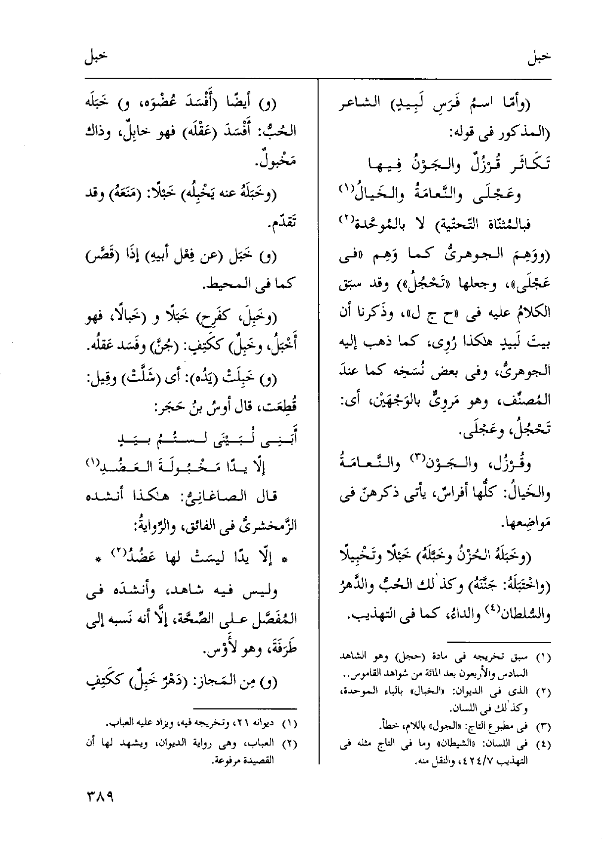 فبالمُثنّاة التّحتّية لَا بالمُوحَّدة ووَهِمَ الجوهريّ كَمَا وَهِم فِي عَجْلَى، وَجعلهَا تَحْجُلُ وَقد سبَق الكلامُ عَلَيْهِ فِي ح ج ل، وذَكرنا أَن بيتَ لَبيدٍ هَكَذَا رُوِي، كَمَا ذهب إِلَيْهِ الجوهريُّ، وَفِي بعض نُسَخِه كَمَا عندَ المُصنِّف، وَهُوَ مَروِي بالوَجْهَيْن، أَي: تَحْجُلُ، وعَجْلَي. وقُرزُل، والجَوْن والنَّعامَةُ والخَيالُ: كلُّها أفراسٌ، يَأْتِي ذكرهنّ فِي مَواضِعها. وخَبَلَهُ الحُزْنُ وخَبَّلَهُ خَبلاً وتَخْبِيلاً واخْتَبَلَهُ: جَنَّنَهُ وَكَذَلِكَ الحُبُّ والدَّهرُ والسُّلطان والداءُ، كَمَا فِي التَّهْذِيب. أَيْضا أَفْسَدَ عُضْوَه، خَبَلَه الحُبُّ: أَفْسَدَ عَقْلَه فَهُوَ خابِلٌ، وَذَاكَ مَخْبولٌ. وخَبَلَهُ عَنهُ يَخْبِلُه خَبلاً: مَنَعَهُ وَقد تَقدّم. خَبَل عَن فِعْل أبيهِ إذَا قَصَّر كَمَا فِي الْمُحِيط. وخَبِلَ، كفَرِح خَبَلاً خَبالاً، فَهُوَ أَخْبَلُ، وخَبِلٌ ككَتِفٍ: جُنَّ وفَسَد عَقلُه. خَبِلَتْ يَدُه: أَي شَلَّتْ وقِيل: قُطِعَت، قَالَ أوسُ بنُ حَجَر: