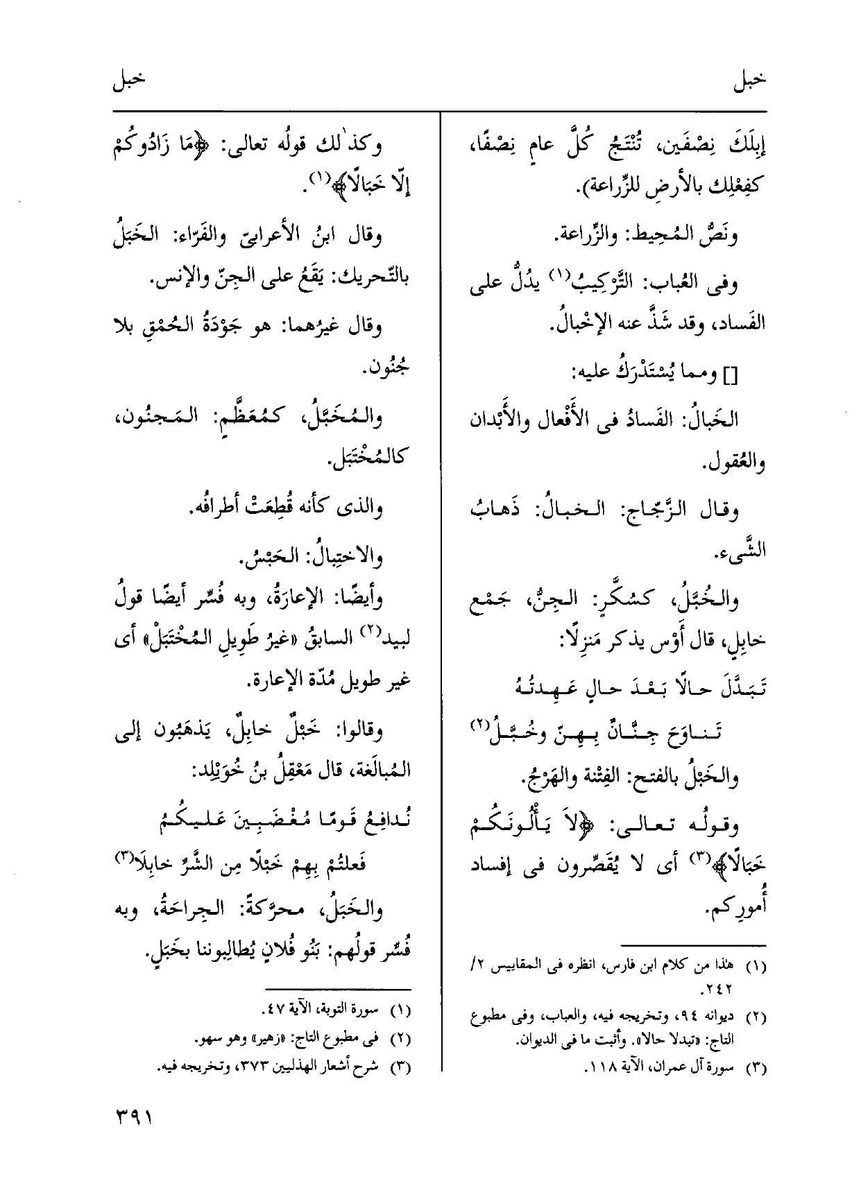 والخَبلُ بِالْفَتْح: الفِتْنة والهَرْجُ. وَقَوله تَعَالَى: لاَ يَأْلُونَكُمْ خَبَالاً أَي لَا يُقَصِّرون فِي إِفْسَاد أُمورِكم. وَكَذَلِكَ قولُه تَعَالَى: مَا زَادُوكُمْ إِلَّا خَبَالاً. وَقَالَ ابنُ الأعرابيّ والفَرّاء: الخَبَلُ بالتّحريك: يَقَعُ على الجِنّ وَالْإِنْس. وَقَالَ غيرُهما: هُوَ جَوْدَةُ الحُمْقِ بِلَا جُنُون. والمُخَبَّلُ،)