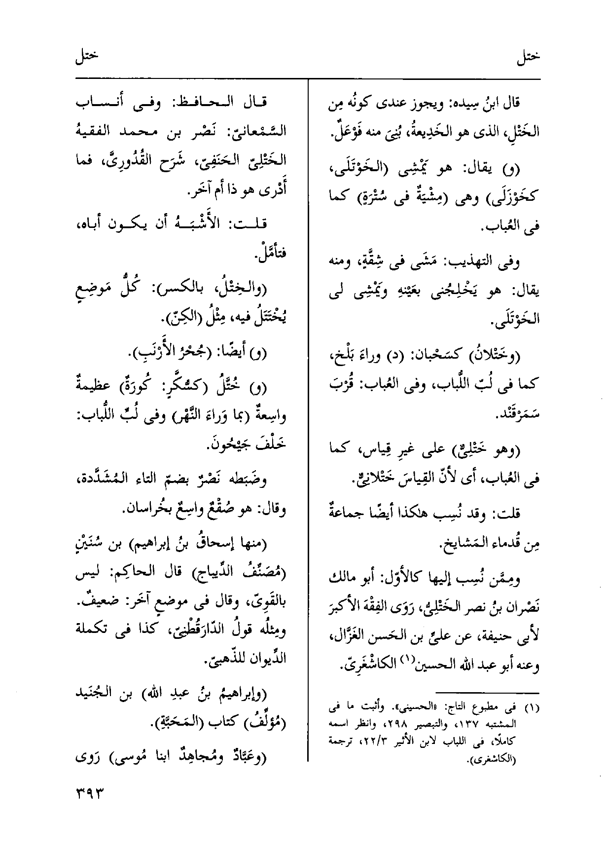 قَالَ ابنُ سِيده: وَيجوز عِنْدِي كونُه مِن الخَتْلِ، الَّذِي هُوَ الخَدِيعةُ، بُنيَ مِنْهُ فَوعَلٌ. يُقَال: هُوَ يَمْشِي الخَوْتَلَى، كخَوزَلَى وَهِي مِشْيَةٌ فِي سُتْرَةٍ كَمَا فِي العُباب. وَفِي التَّهْذِيب: مَشَى فِي شِقَّةٍ، وَمِنْه يُقَال: هُوَ يَخْلِجُني بعَينهِ وَيمْشِي لي الخَوْتَلَى. وخَتْلانُ كسَحْبان: د وراءَ بَلْخ، كَمَا فِي لُبّ اللُّباب، وَفِي العُباب: قُربَ سَمَرقَنْد. وَهُوَ خَتْلِيٌّ على غيرِ قِياس، كَمَا فِي العُباب، أَي لأنّ القِياسَ خَتْلانيٌّ. قلت: وَقد نُسِب هَكَذَا أَيْضا جماعةٌ مِن قُدماء المَشايخ. ومَمّن نُسِب إِلَيْهَا كالأوّل: أَبُو مَالك نَصْران بنُ نصر الخَتْلِيُّ، رَوَى الفِقْهَ الأكبرَ لأبي حنيفَة، عَن عَليّ بن الحَسن الغَزَّال، وَعنهُ أَبُو عبد الله الْحُسَيْن الكاشْغَرِيّ. قَالَ الْحَافِظ: وَفِي أَنْسَاب السَّمعاني: نَصْر بن مُحَمَّد الفقيهُ الخَتْلِي الحَنَفِي، شَرَح القُدُورِيَّ، فَمَا أَدْري هُوَ ذَا أم آخَر. قلت: الأَشْبَهُ أَن يكون أَبَاهُ، فتأمَّلْ. والخِتْلُ، بِالْكَسْرِ: كُلُّ مَوضِعٍ يُخْتَتَلُ فِيهِ، مِثْلُ الكِنّ. أَيْضا: جُحْرُ الأَرْنَبِ. خُتَّلُ كسُّكَّرٍ: كُورَةٌ عظيمةٌ واسِعةٌ بِمَا وَراءَ النَّهْر وَفِي لُبِّ اللُّباب: خَلْفَ جَيحُونَ. وضَبَطه نَصْرٌ بضمّ التَّاء المُشَدَّدة، وَقَالَ: هُوَ صُقْعٌ واسِعٌ بخُراسان. مِنْهَا إسحاقُ بنُ إِبْرَاهِيم بن سُنَينٍ مُصَنِّفُ الدِّيباج قَالَ الحاكِم: لَيْسَ بالقَوِيّ، وَقَالَ فِي موضعٍ آخَر: ضعيفٌ. ومِثلُه قولُ الدّارَقُطْني، كَذَا فِي تَكْمِلَة الدِّيوان للذّهبي. وإبراهيمُ بنُ عبدِ الله بن الجُنَيد مُؤلِّفُ كتاب المَحَبَّةِ.