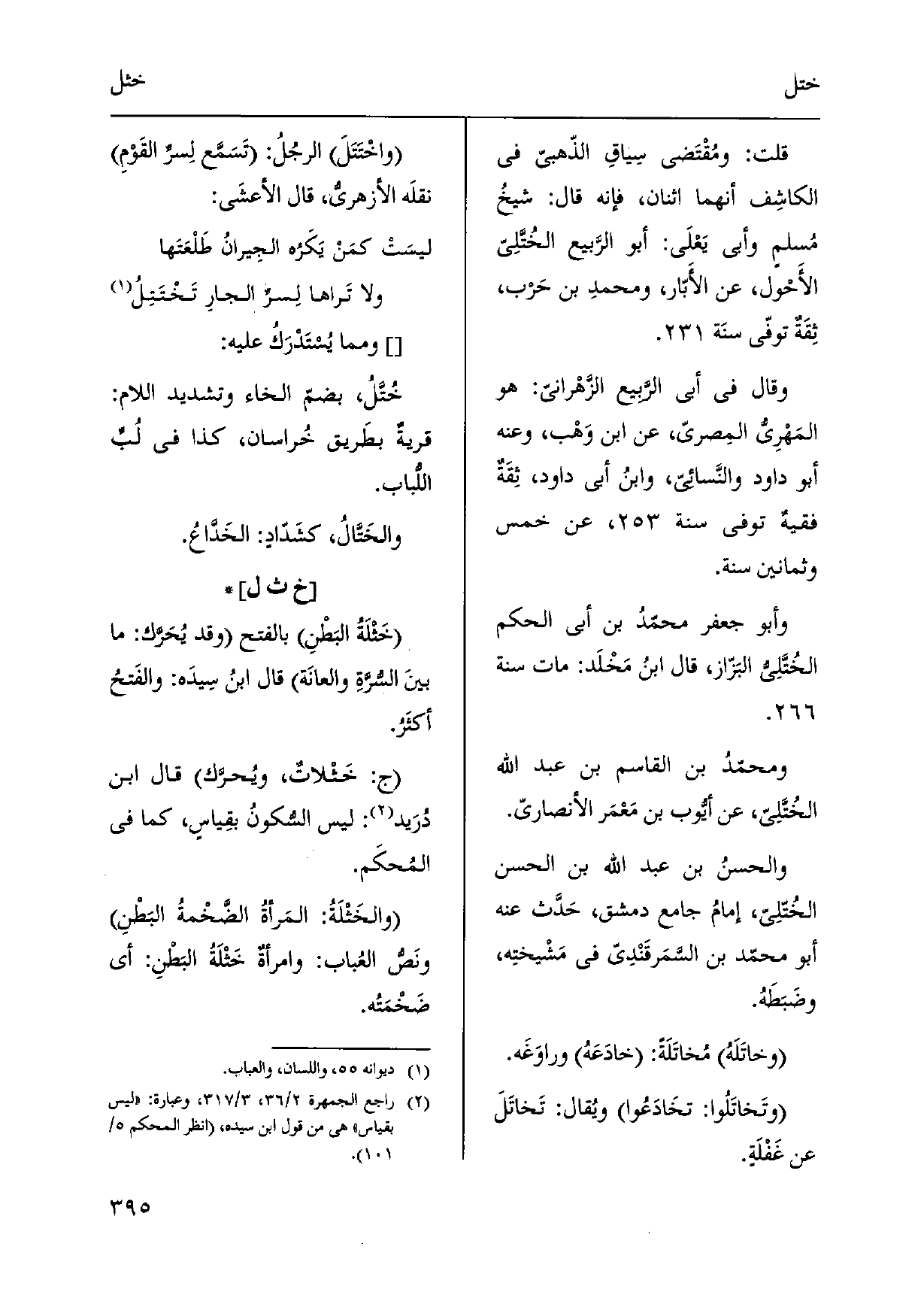 وَقَالَ فِي أبي الَّربيع الزَّهْراني: هُوَ المَهْرِيّ المِصريّ، عَن ابْن وَهْب، وَعنهُ أَبُو دَاوُد والنَّسائي، وابنُ أبي دَاوُد، ثِقَةٌ فقيهٌ توفّي سنة، عَن خمس وَثَمَانِينَ سنة. وَأَبُو جَعْفَر محمّدُ بن أبي الحكم الخُتَّلِي البَزّاز، قَالَ ابنُ مَخْلَد: مَاتَ سنة. ومحمّدُ بن الْقَاسِم بن عبد الله الخُتَّلِي، عَن أَيُّوب بن مَعْمَر الأنصاريّ. والحسنُ بن عبد الله بن الْحسن الخُتّلِي، إمامُ جَامع دمشق، حَدَّث عَنهُ أَبُو محمّد بن السَّمَرقَنْدِيّ فِي مَشْيختِه، وضَبَطَهُ. وخاتَلَهُ مُخاتَلَةً: خادَعَهُ وراوَغَه. وتَخاتَلُوا: تخَادَعُوا ويُقال: تَخاتَلَ عَن غَفْلَةٍ. واخْتَتَلَ الرجُلُ: تَسَمَّع لِسرِّ القَوْمِ نقلَه الأزهريُّ، قَالَ الأعشَى:
