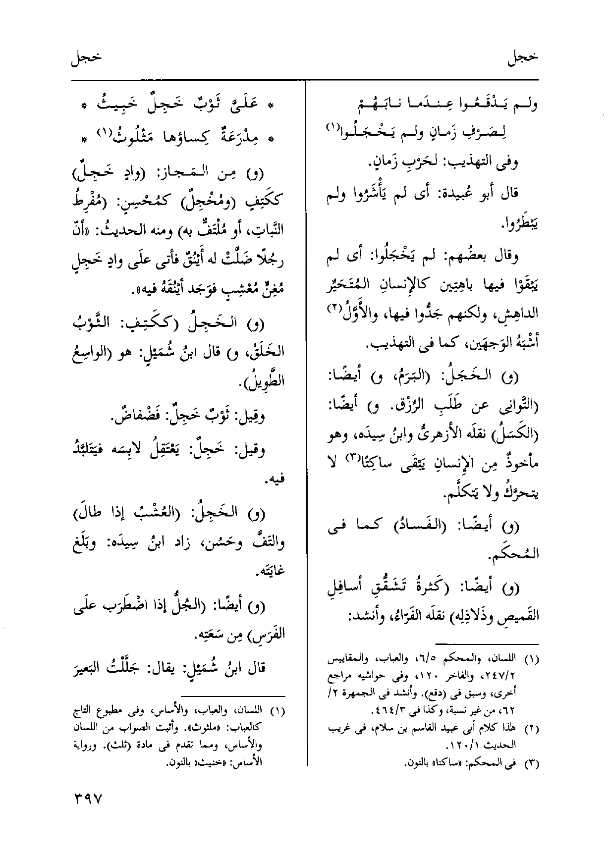 وَفِي التَّهْذِيب: لحَربِ زَمانٍ. قَالَ أَبُو عُبيدة: أَي لم يَأْشَرُوا وَلم يَبطرُوا. وَقَالَ بعضُهم: لم يَخْجَلُوا: أَي لم يَبقَوْا فِيهَا باهِتِين كالإِنسانِ المُتَحَيِّر الداهِشِ، وَلَكنهُمْ جَدُّوا فِيهَا، والأَوَّلُ أشْبَهُ الوَجهَين، كَمَا فِي التَّهْذِيب. الخَجَل: البَرَمُ، أَيْضا: التَّواني عَن طَلَبِ الرِّزْق. أَيْضا: الكَسَلُ نقلَه الأزهريُّ وابنُ سِيدَه، وَهُوَ مَأْخُوذ مِن الإِنسانِ يَبقَى ساكِتاً لَا يتحرَّكُ وَلَا يَتكلَّم. أَيْضا: الفَسادُ كَمَا فِي المُحكَم. أَيْضا: كَثرةُ تَشَقُّقِ أسافِلِ القَميصِ وذَلاذِلِه نقلَه الفَرّاءُ، وَأنْشد: عَلَيَّ ثَوْبٌ خَجِلٌ خَبِيثُ) مِدْرَعَةٌ كِساؤها مَثْلُوثُ مِن المَجاز: وادٍ خَجِلٌ ككَتِفٍ ومُخْجِلٌ كمُحْسِنٍ: مُفْرِطُ النَّباتِ، أَو مُلْتَف بِهِ وَمِنْه الحديثُ: أنّ رجُلاً ضَلَّتْ لَهُ أَيْنُقٌ فَأتى على وادٍ خَجِلٍ مُغِنٍّ مُعْشِبٍ فوَجَد أيْنُقَهُ فِيهِ. الخَجِلُ ككَتِفٍ: الثَّوْبُ الخَلَقُ، قَالَ ابنُ شُمَيلٍ: هُوَ الواسِعُ الطَّوِيلُ. وقِيل: ثَوْبٌ خَجِلٌ: فَضْفاضٌ. وَقيل: خَجِلٌ: يَعْتَقِلُ لابِسَه فيَتَلبَّدُ الخَجِلُ: العُشْبُ إِذا طالَ والتَفَّ وحَسُن، زَاد ابنُ سِيدَه: وبَلَغ غايَتَه. أَيْضا: الجُلُّ إِذا اضْطَرَب على الفَرَسِ مِن سَعَتِه. قَالَ ابنُ شُمَيلٍ: يُقَال: جَلَّلْتُ البَعيرَ